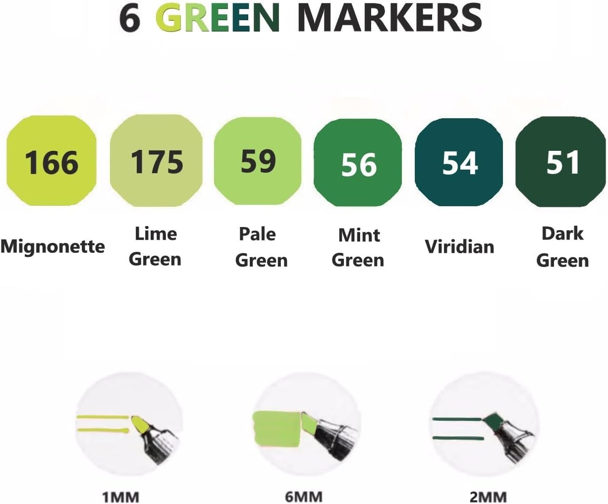 6pcs Green Forest Trees Grass Colors Alcohol Markers Set, Dual Tips Art Markers Drawing Sketched Double Tipped for Adults Kids (Green)