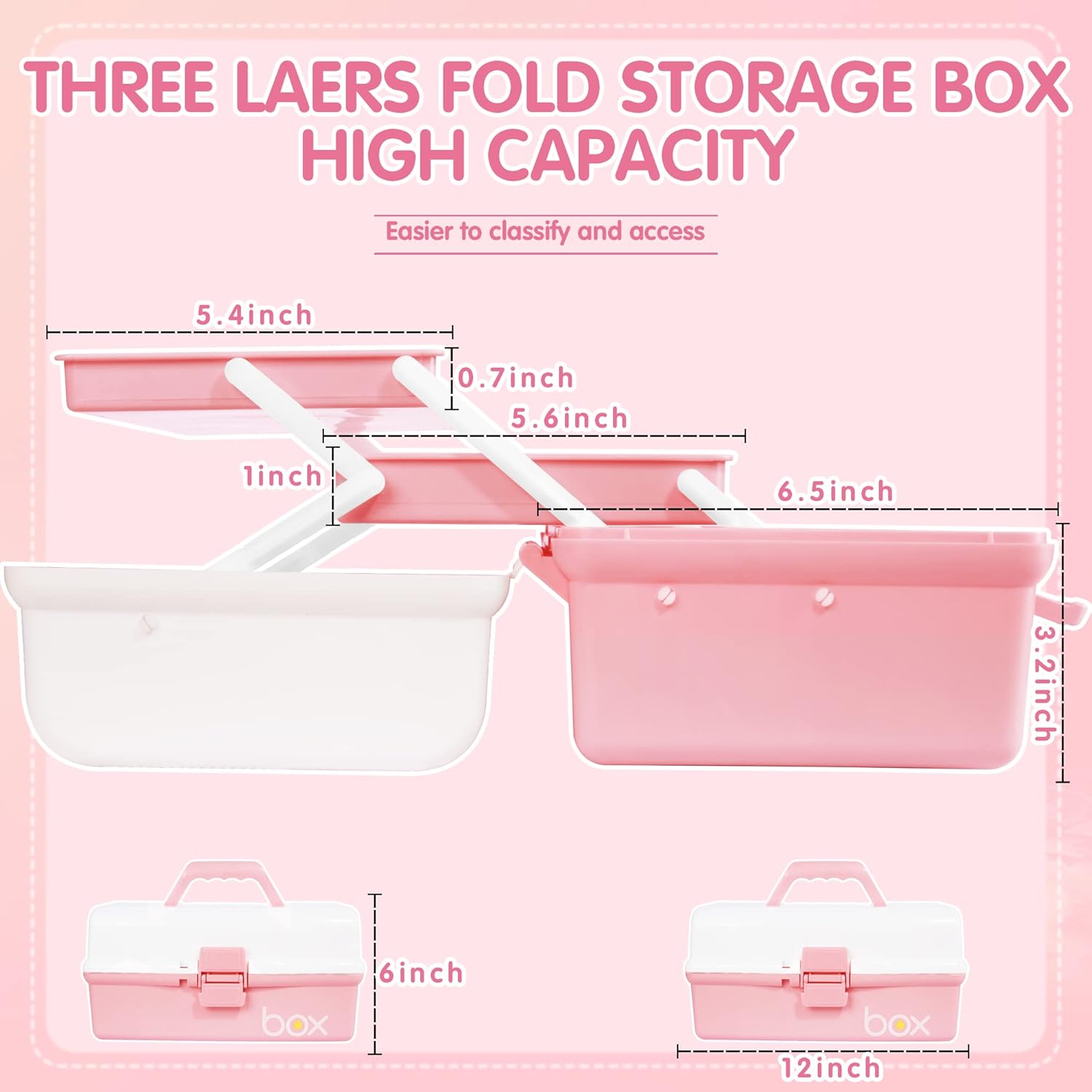 12in Three-Layer Multipurpose Storage Box Organizer Folding Tool Box/Art & Crafts Case/Sewing Supplies Organizer/Medicine Box/Family First Aid Box with 2 Trays (White Pink)