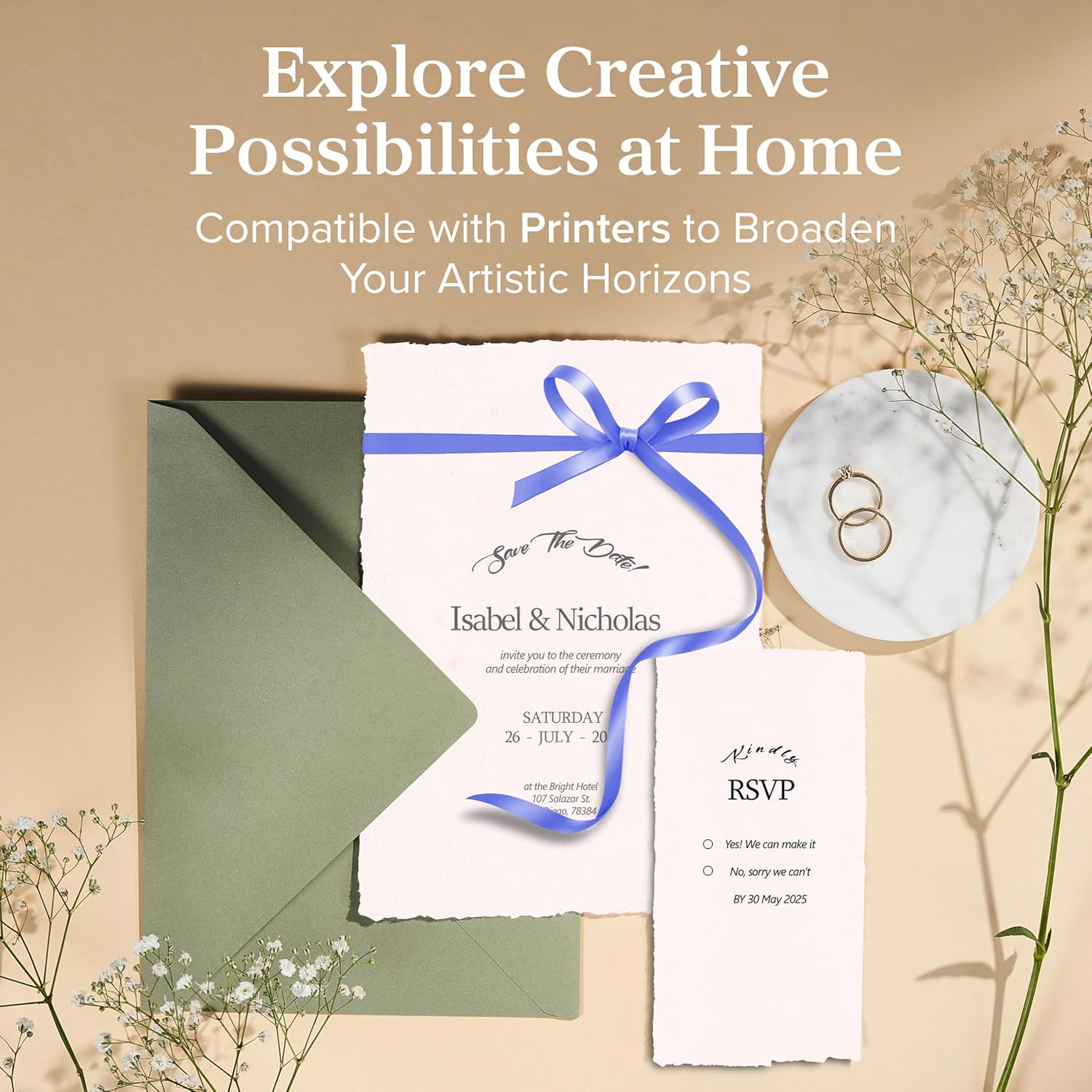 - [Home Printer Friendly]: Our deckled edge 150gsm paper is compatible with home printers, offering endless possibilities to make a lasting impression with creations such as menus, wedding invitations, cards, or even books. For best results, feed one sheet at a time through the manual feed tray. As printer settings and tolerances can vary, we recommend testing with a sample first to ensure optimal print quality. 50 sheets of 5.8 x 8.3, A5 paper. Ideal for creating cards, journal pages, print photos, and more