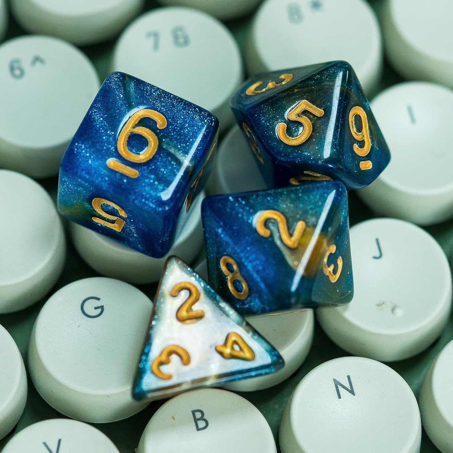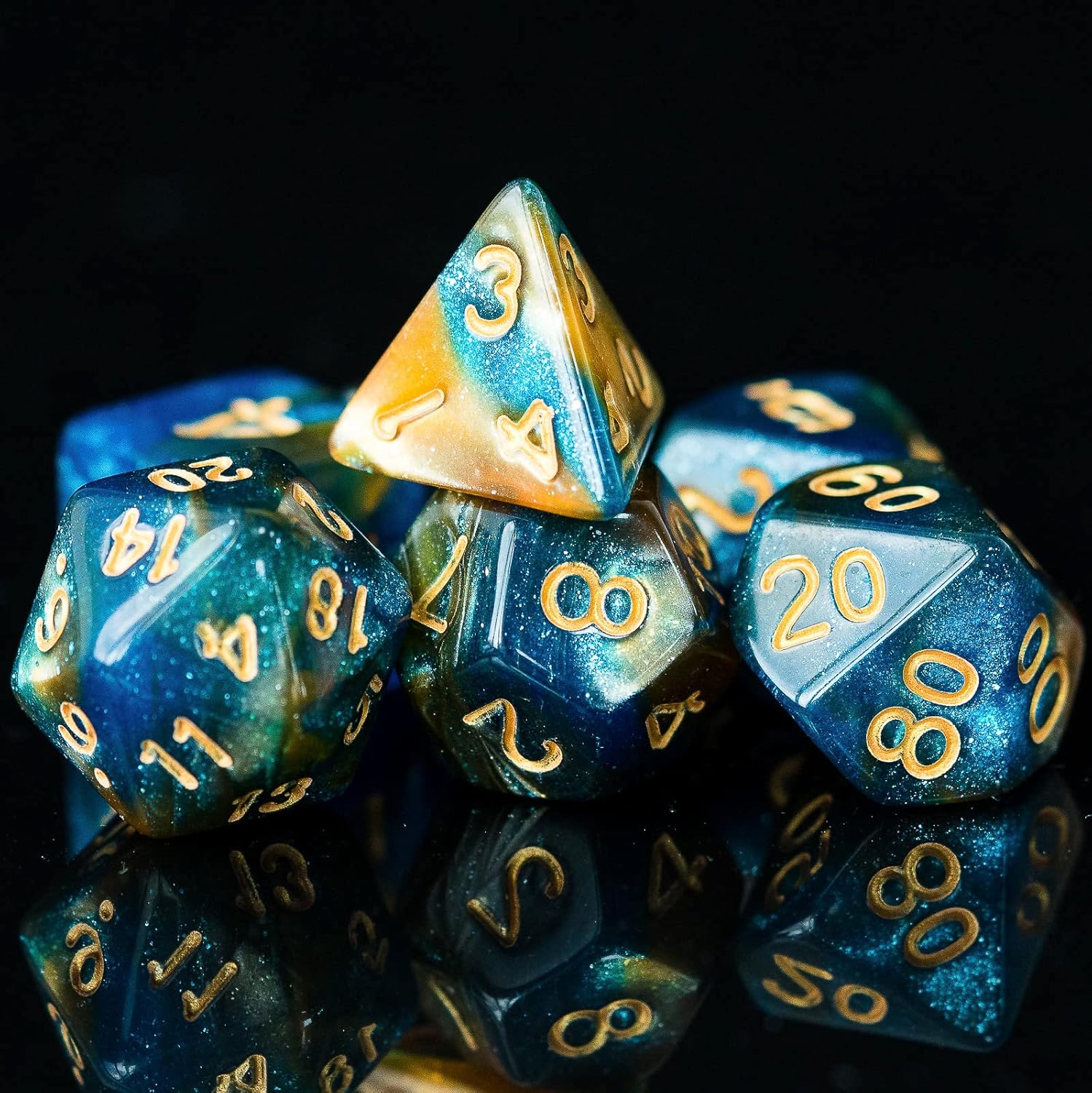 - Beautiful Colors: Blue with yellow marbled together in perfect harmony, combines with sparkling glitter design, makes the d&d dice look like the galaxy. A Great Gift for a Friend/Father/Siblings, Fellow Player, or Dungeon Master.
