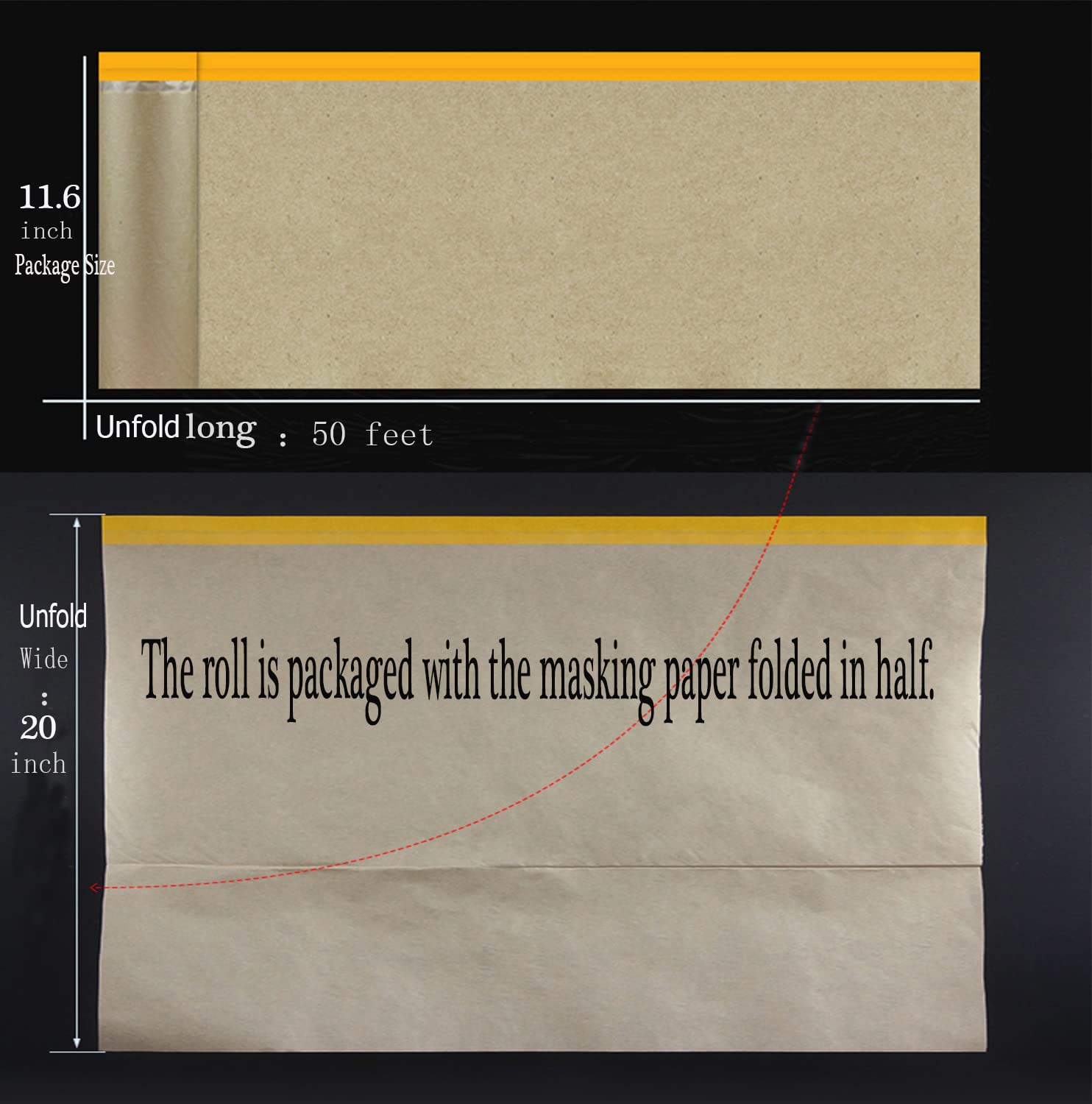 - 【Easy to Use】 Our paint masking paper is super easy to apply, masking paper roll design, the roll is packaged with the paper folded in half(Each roll is 20 inches wide and 50 feet long).You just need to unroll the paper roll and stick the sticky side firmly on right position,then cut it with scissors or tear it by hand, the painters paper roll will cover the protected object evenly.