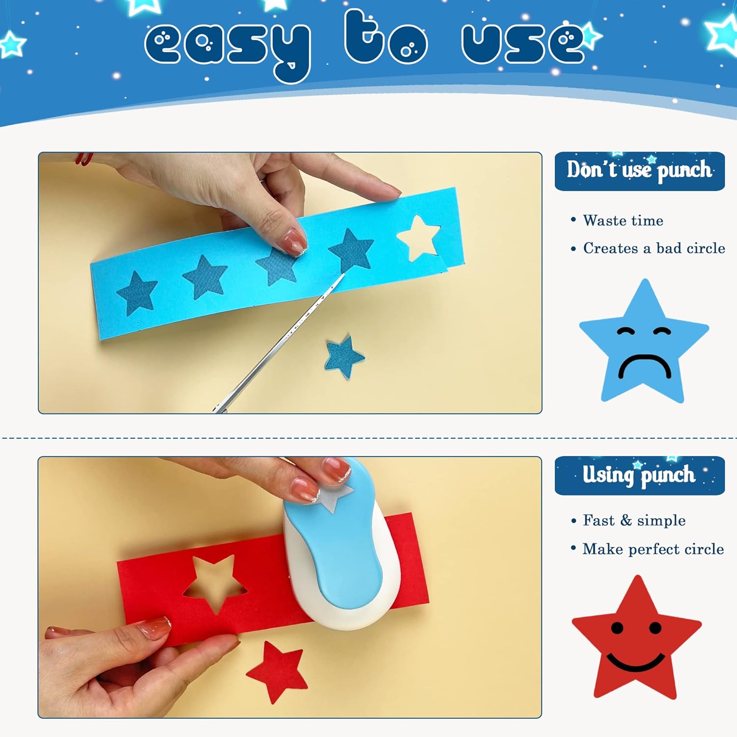 - ✿ CREATE YOUR OWN DESIGN: You can make different artwork according to your imagination, a perfect option for kids to develop their minds, our star punch is suitable for Art Works, DIY crafts, decorate your scrapbooks diary, photo album, envelope, greeting cards, gift wrapping and many other paper handmade products.