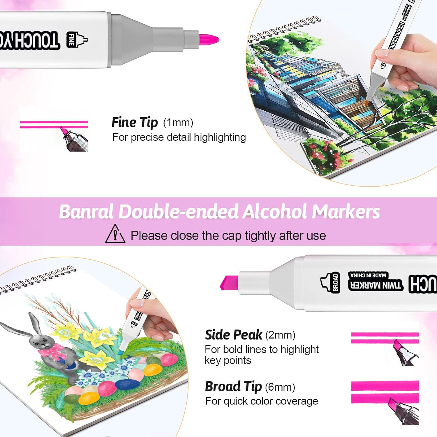 - 【DUAL TIP MARKERS】Banral 262 Colors art markers set, Broad chisel (approx. 2-6mm) and fine point(approx. 1mm) nibs for precise highlighting and underlining. Allowing you to write in both thin and thick lines, providing great versatility and immerse yourself in art. NOTE: Because they are alcohol based markers like all other brand markers, they will bleed into regular coloring paper, except very thick paper, marker paper.