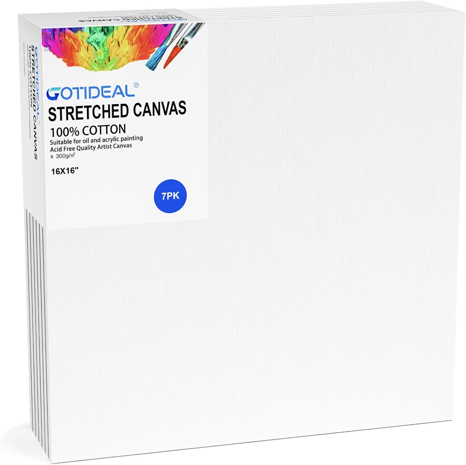 GOTIDEAL Stretched Canvases for Painting, 16x16 Inch Set of 7, Primed White - 100% Cotton Blank Art Square Canvas Boards for Painting for Acrylic Pouring, Oil Paint Dry & Wet Art Media
