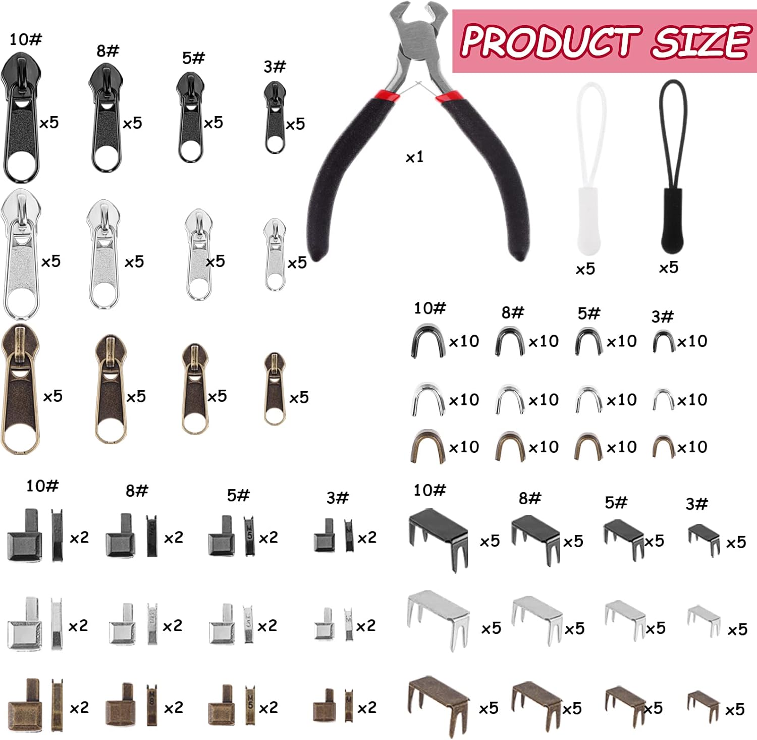 - Packaging Contains: there are 275 pieces of zipper pull replacements repair kit, including 60 pieces of sliders ( #3 #5 #8 #10) in 3 colors, and 20 pieces of each color, 60 pieces of bottom stops ( #3 #5 #8 #10) in 3 colors, 120 pieces of top stoppers ( #3 #5 #8 #10) in 3 colors, 24 pieces of zipper pins ( #3 #5 #8 #10) in 3 colors, 10 pieces of sliders for nylon coil zippers extension pulls in 2 colors and 1 piece of zipper install plier, various sizes to your demands.