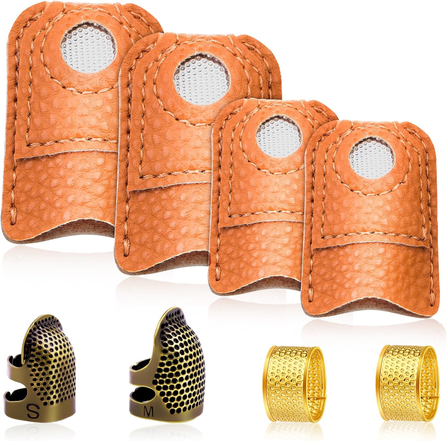 - Thimble Set: You will receive a 1*M metal sewing thimble, 1*S metal sewing thimble, 2 large leather finger protectors and 2 small leather finger protectors, and 2 *ring thimbles, enough for your needs.