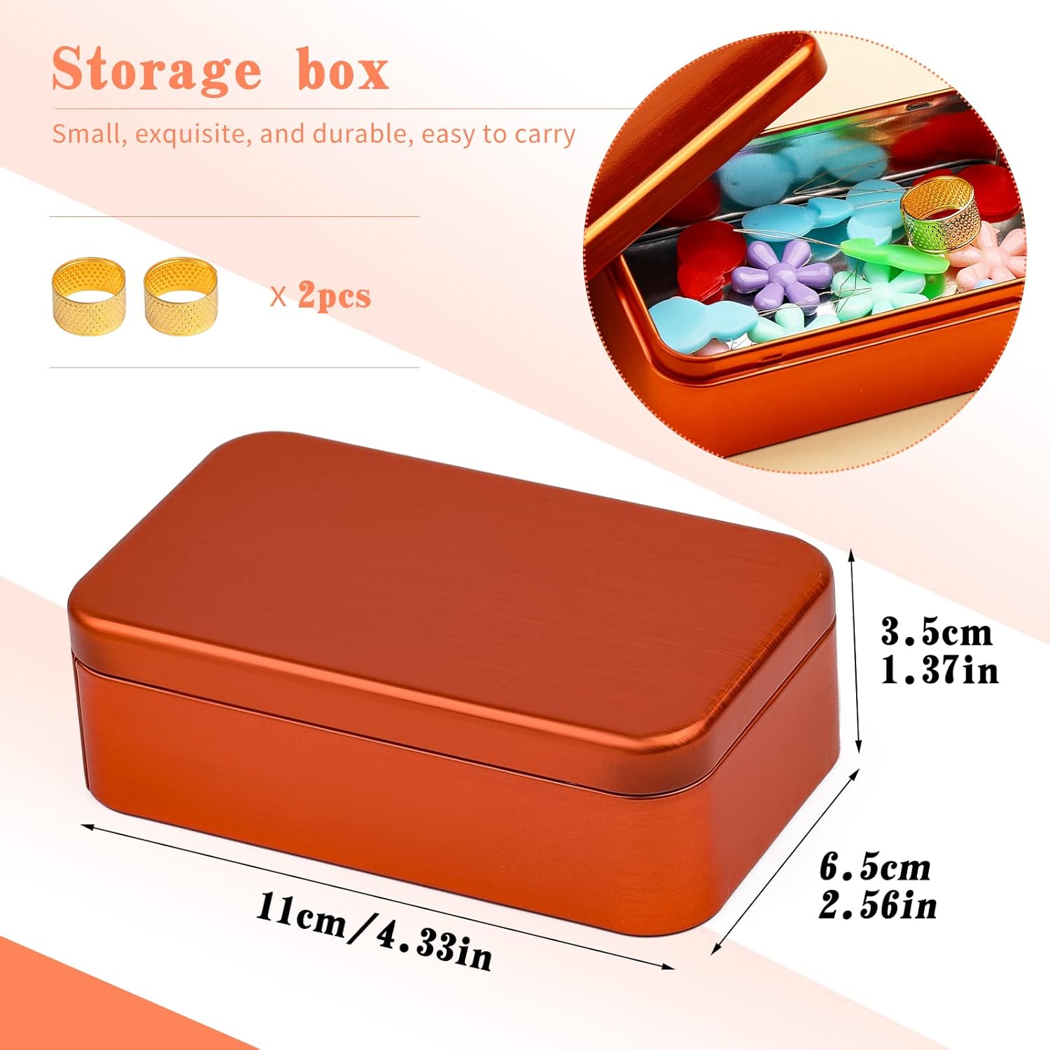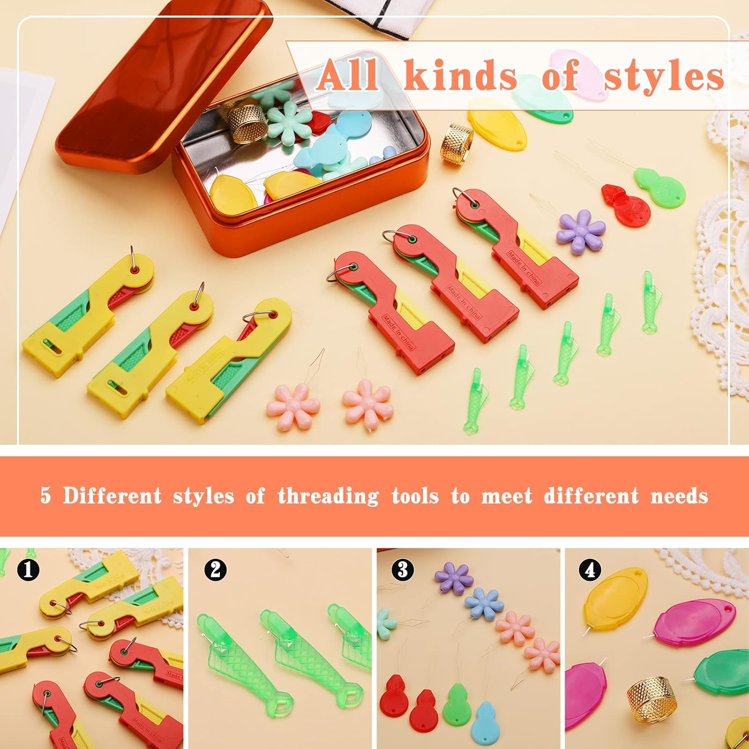 - 【Package Includes】You will receive 30 pieces of needle threaders in 5 different shapes,2 pieces of sewing thimble,1 piece of bubble bag,and 1 piece of Random color Metal storage box(11*6.5*3.5cm),34 pieces in total.These 5 different threading devices are perfect for all needle hole types, whether they are large or small eye needles.Meet any usage needs you may have when threading needles.