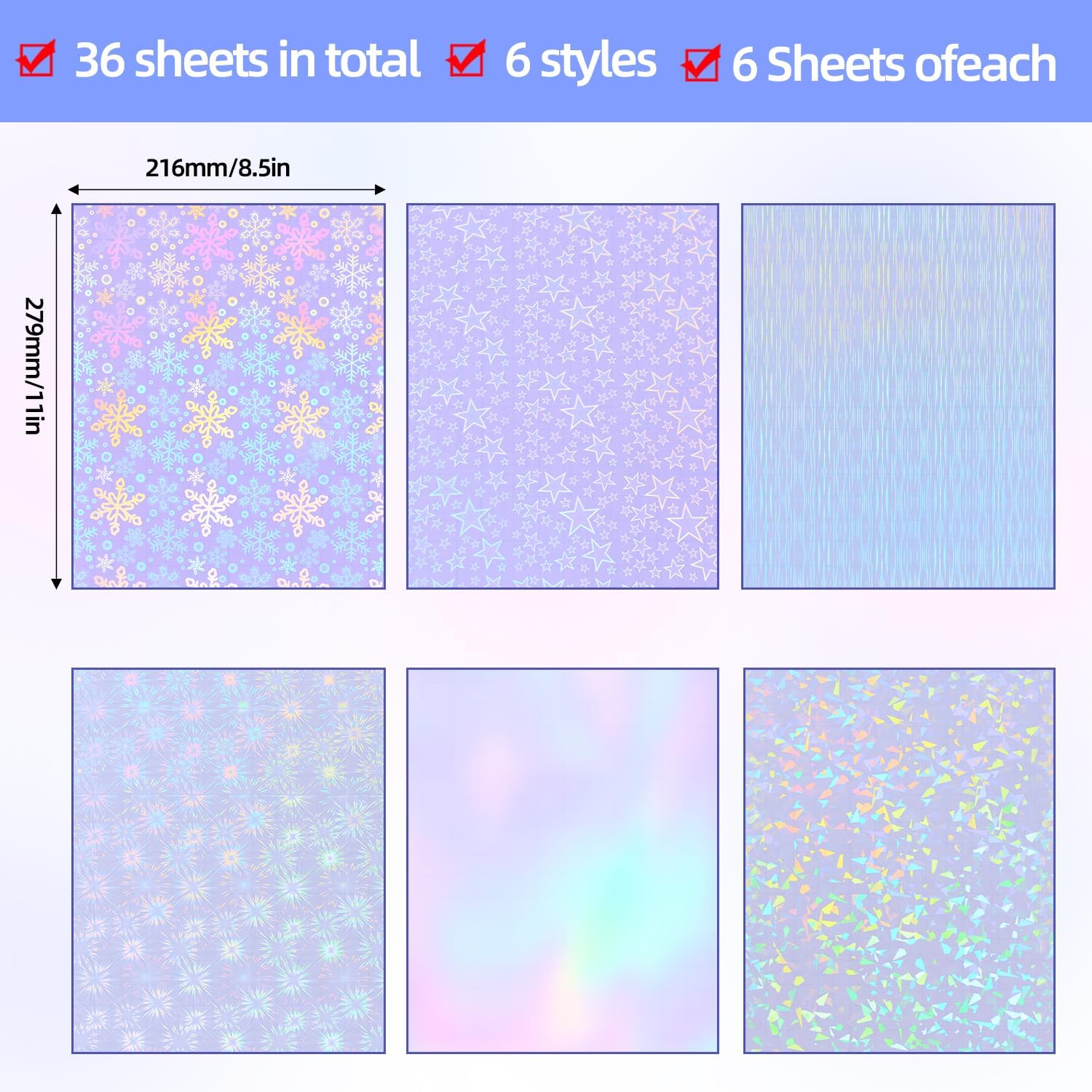 36 Sheets Holographic Sticker Paper, Clear Vinyl Laminate Film for Stickers Waterproof, Transparent Overlay Lamination Sticker Paper Self-Adhesive, 6 Patterns-8.5x11 Inch
