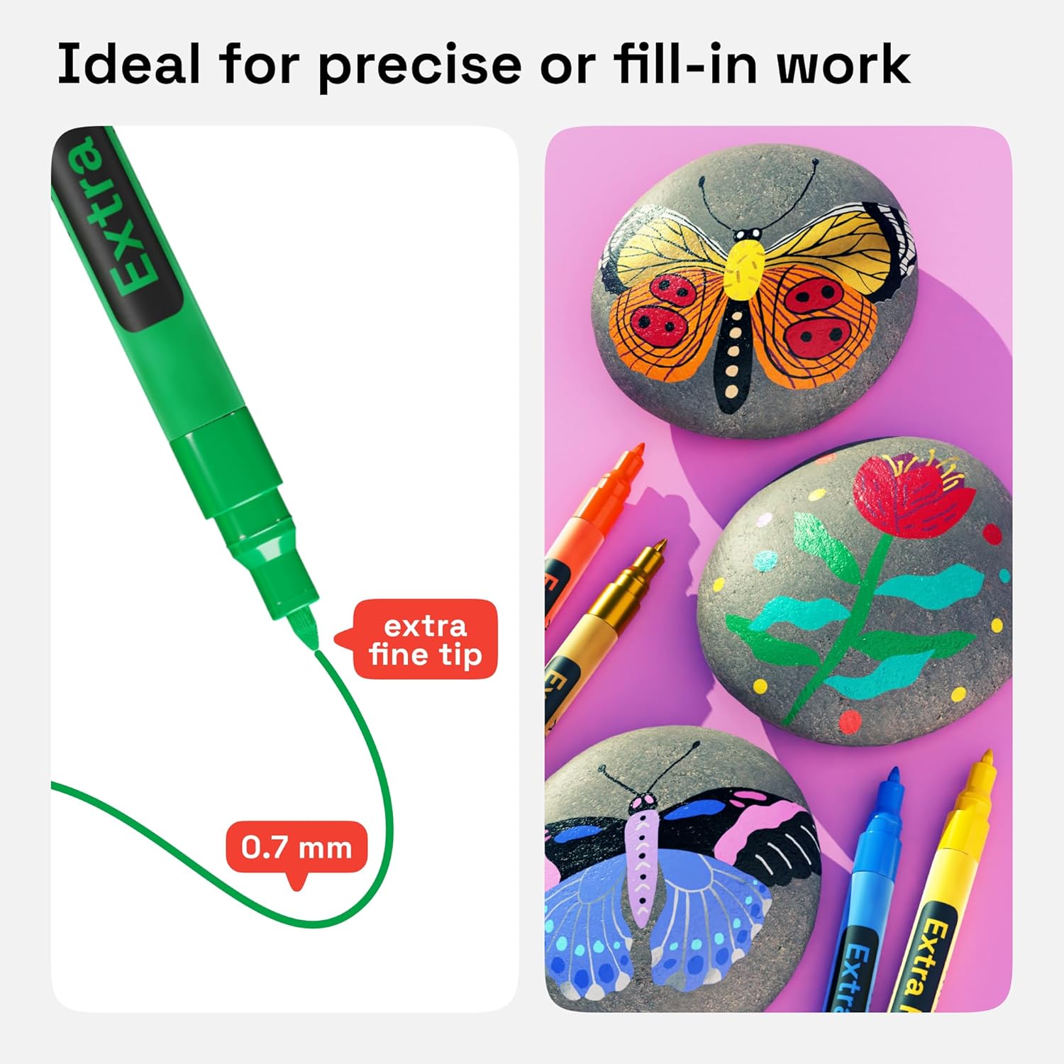 - EXTRA FINE TIP: The 0.7mm tip on each paint pen is perfect for adding labels and highlighting. The acrylic paint markers are equipped with Japanese nylon nibs. Use your Japanese paint markers for drawing, fine line work, and detailed DIY projects.