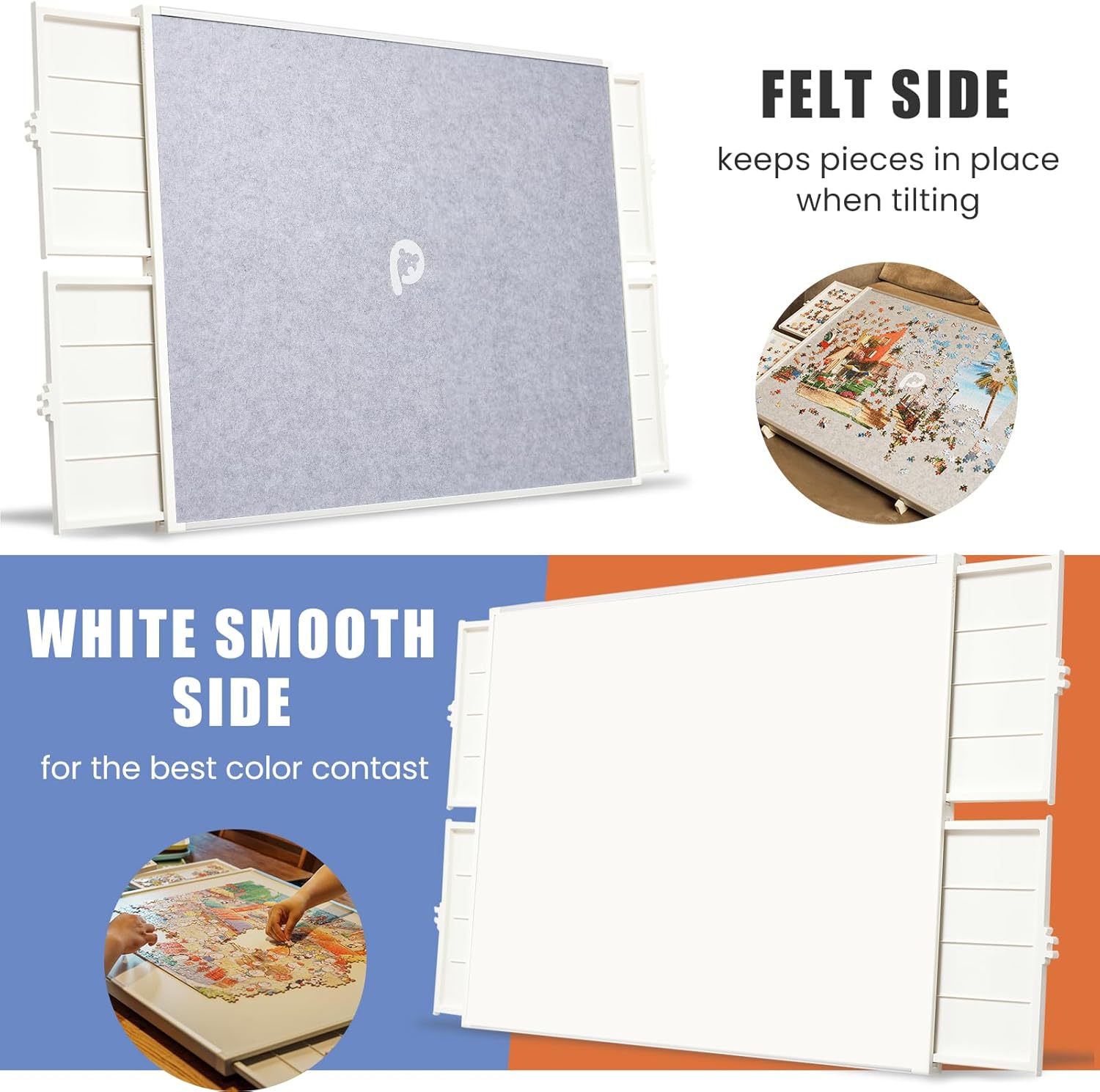 - 🌟All in One Solution This Dual-Sided Rotating Plastic puzzle board with Drawers features a large, white Smooth surface and a non-slip Felt surface. This jigsaw puzzle board also comes with a Lazy Susan to rotate, a tilt stand and a clear puzzle cover mat.