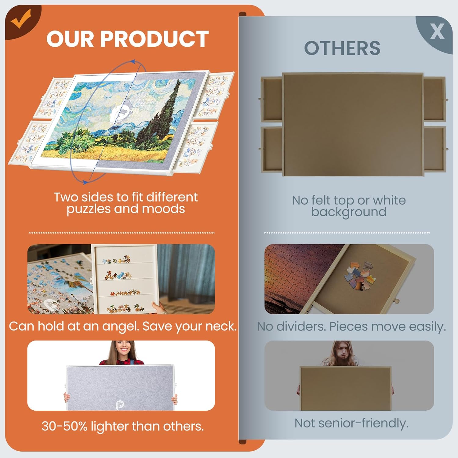 - 🎁A delicate present for Puzzlers The elegant and functional details make this rotating puzzle board with drawers the perfect present for mom, dad and all adults. It makes a great present for birthdays, anniversaries and more holidays! Puzzle enthusiasts of all ages deserve puzzle accessories of the best quality!