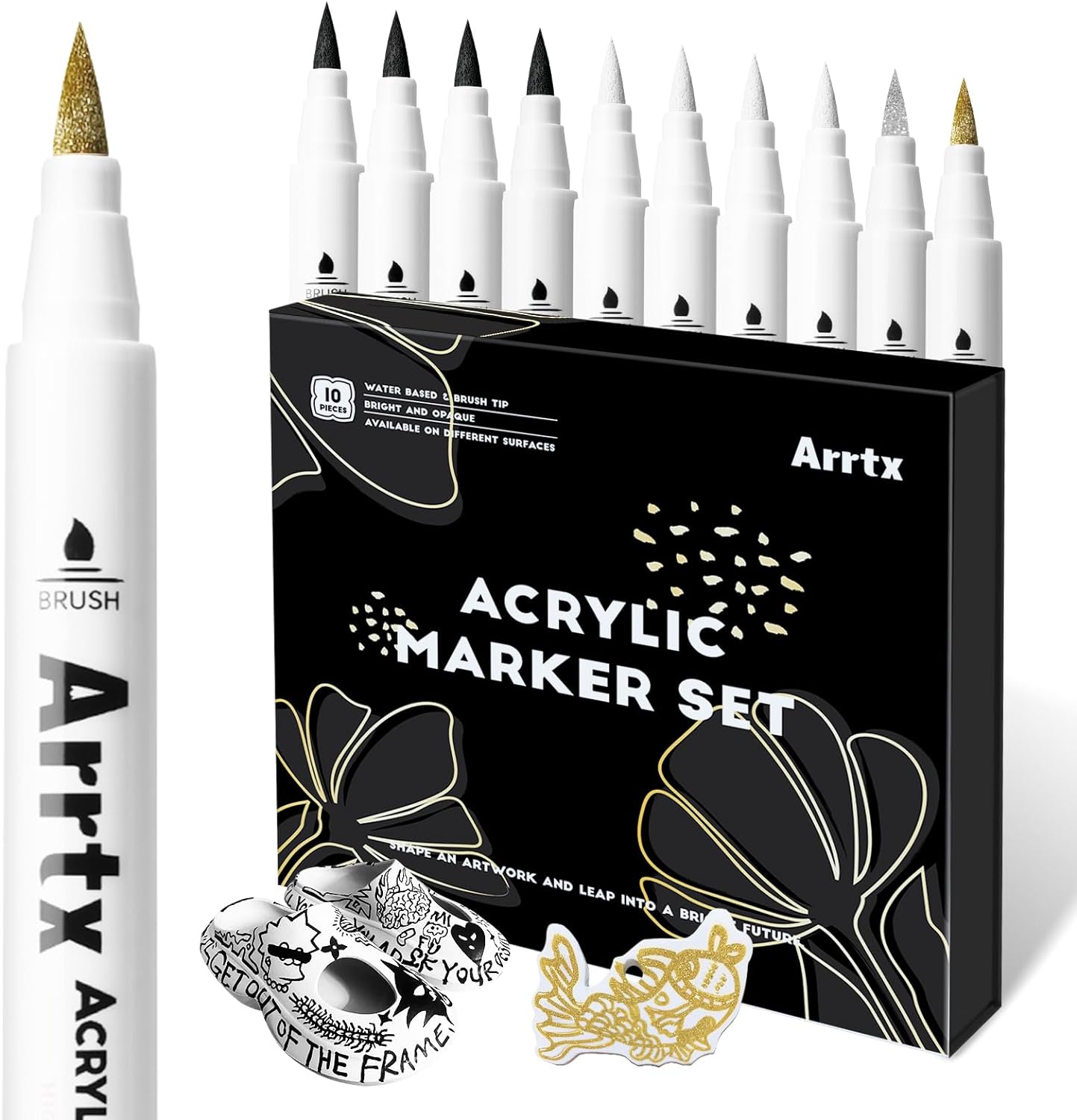 Arrtx Acrylic Paint Pens, 10 Pack Extra Brush Tip White Paint Markers Metallic for Rock Fabric Wood Glass Canvas Ceramic, 4 White 4 Black 1 Gold & 1 Silver, Water Based Ink, DIY Crafts
