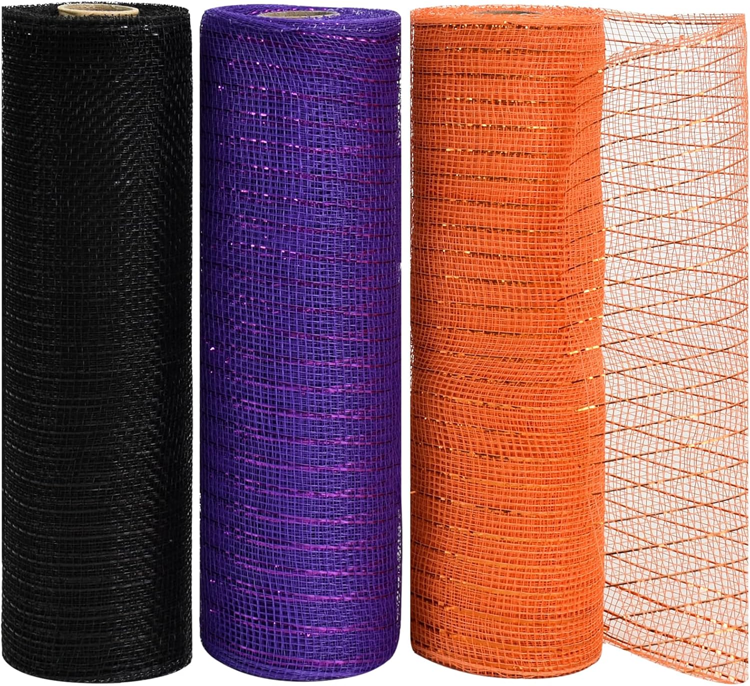 - 【3 Rolls 10 inch Decor Mesh】This decorative mesh ribbon is 10 inch wide and 30 ft (10 Yard) each roll. Total 90 feet each set(3 Rolls). A variety of festive styles options available.Featuring sparkling metallic strips.Orange + purple + black,Perfect for Thanksgiving Day,Fall,Christmas,Halloween.