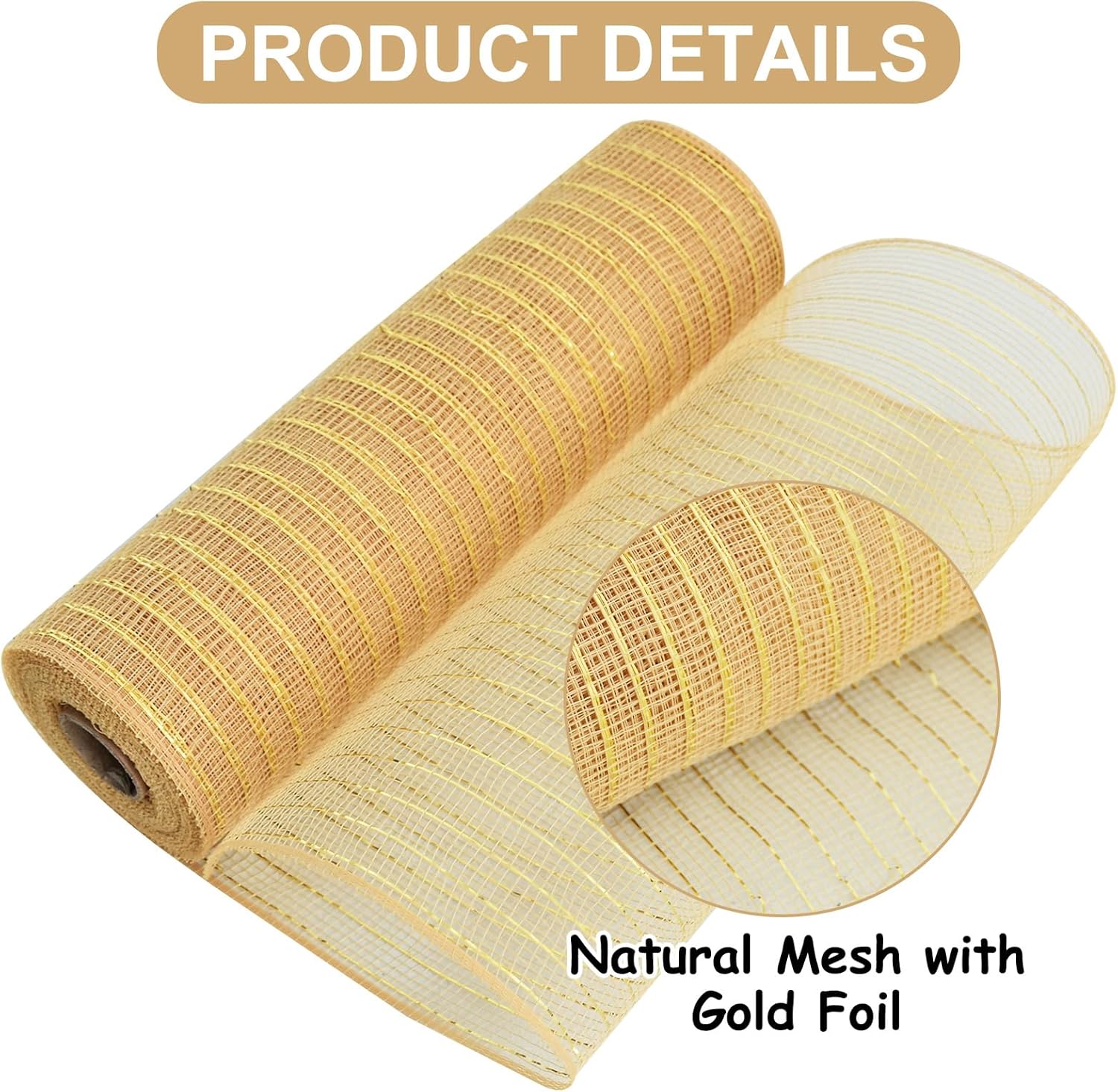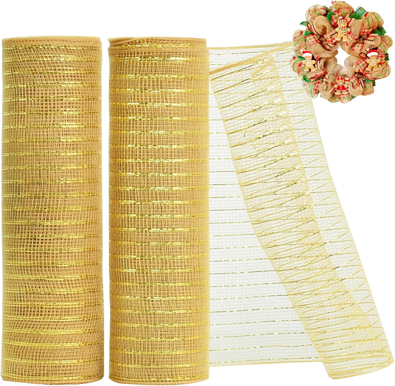 TONIFUL 2 Rolls 10 Inch Khaki Decorative Mesh Ribbbon Rolls, Fabric Mesh with Foil for Wreath Supplies, Front Door Wreath Crafts Tree Decor Christmas NewYears Halloween Decoration (10 yds/roll)
