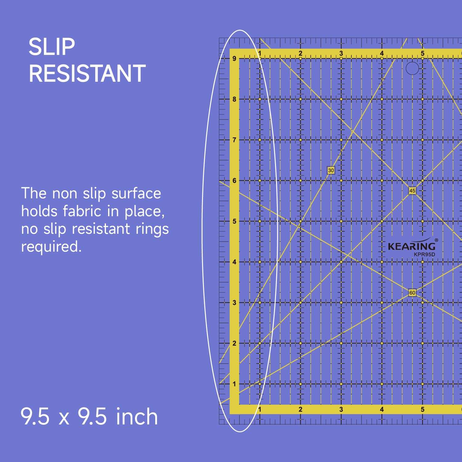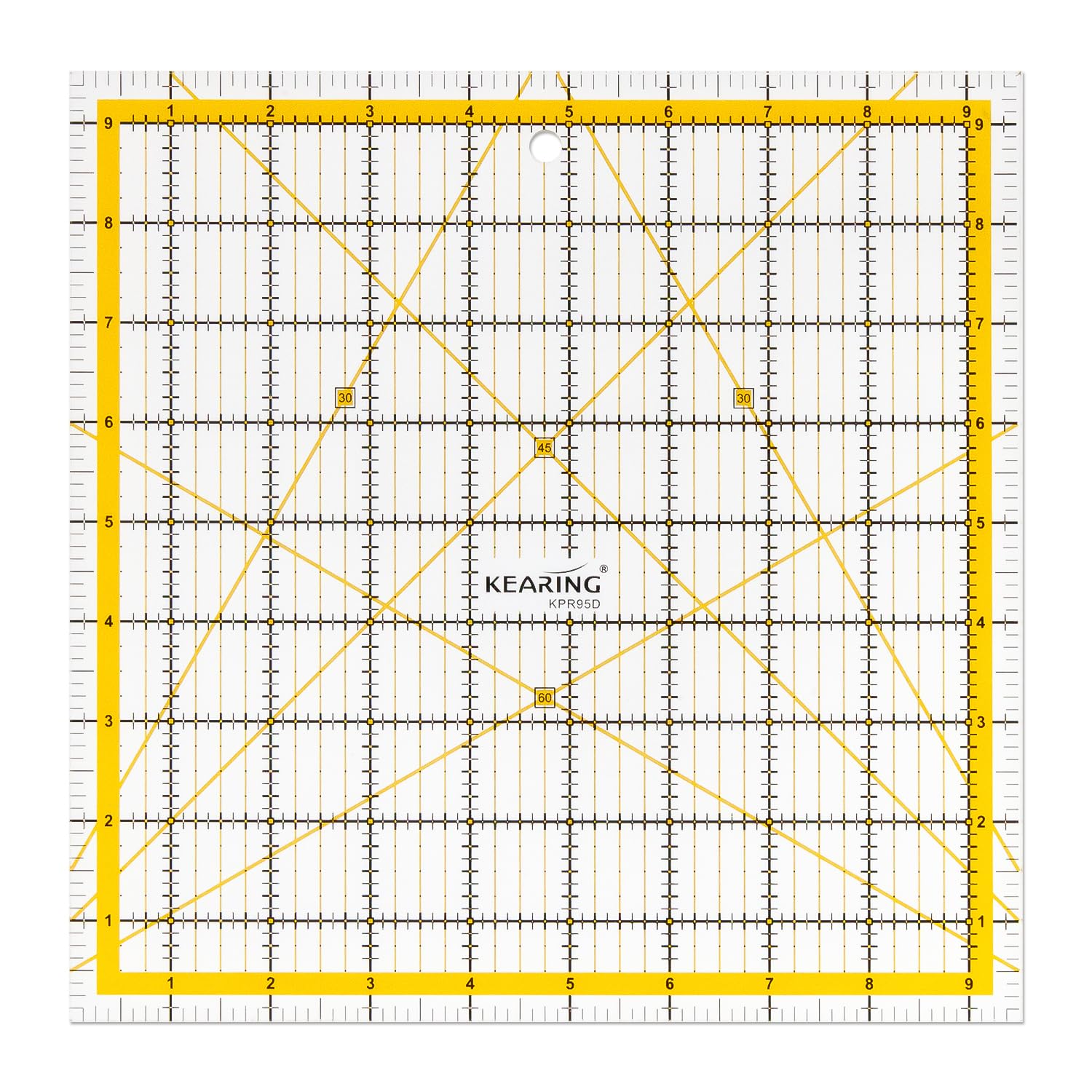 KERING Square Quilting Ruler - 9.5x9.5 inch Anti-Slip Acrylic Ruler for Patchwork Piecing, Bias Strips & Rotary Cutting, Professional Quilter's Tool with Dual-Angle Guide