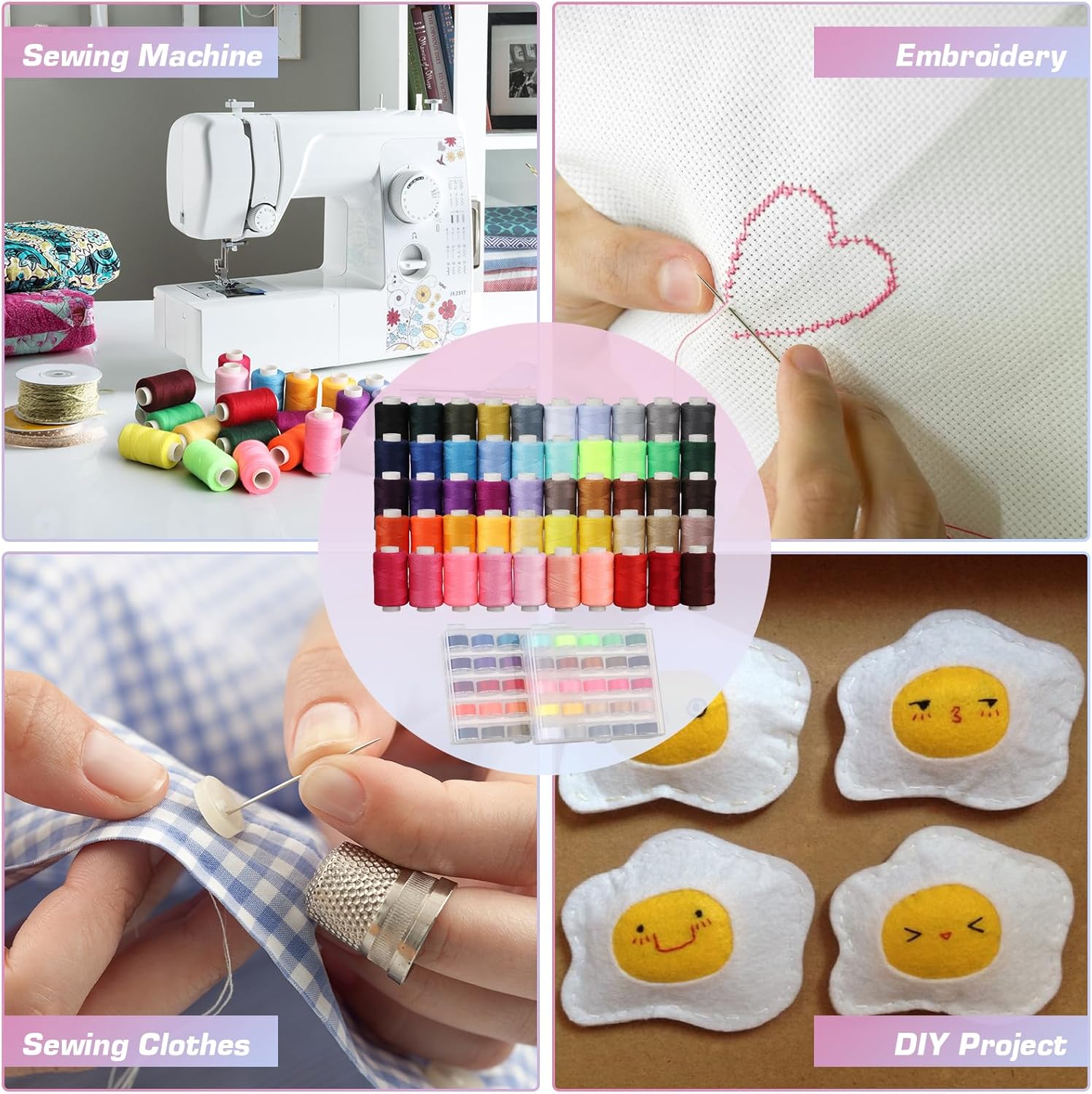- Attractive colors: With 50 colors to choose from sewing thread for sewing machine, Includes white, black, grey, purple, red, pink thread colors. The match colors of the sewing machine thread with bobbin set. this multi-color spool of sewing thread set allows you to pick and choose according to your preference and project requirements