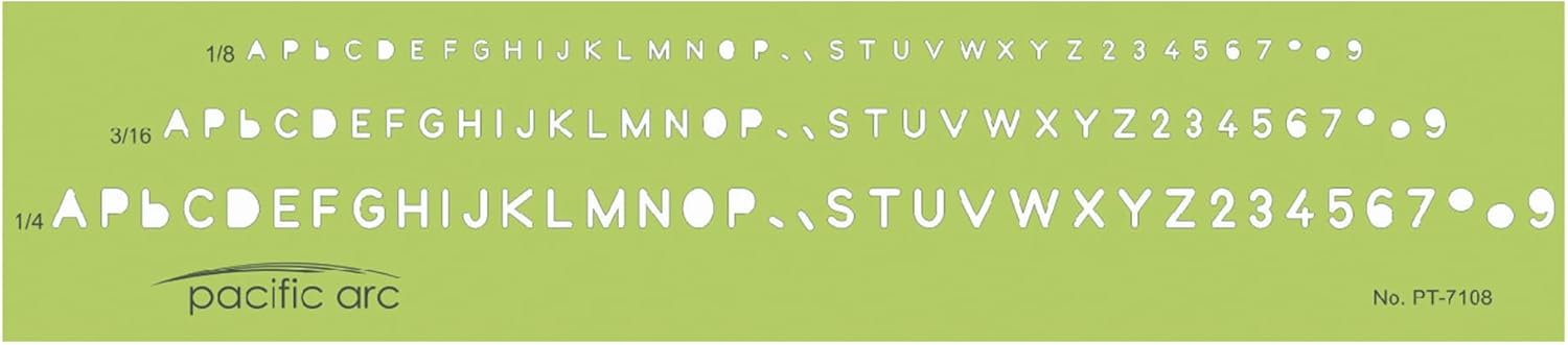 - Alphabet and numbers — An indispensable tool for designers, students, and professionals — The template features the alphabet and natural numbers. Made of durable translucent green plastic and is available in 1/8'', 3/16'', 1/4'' sizes.