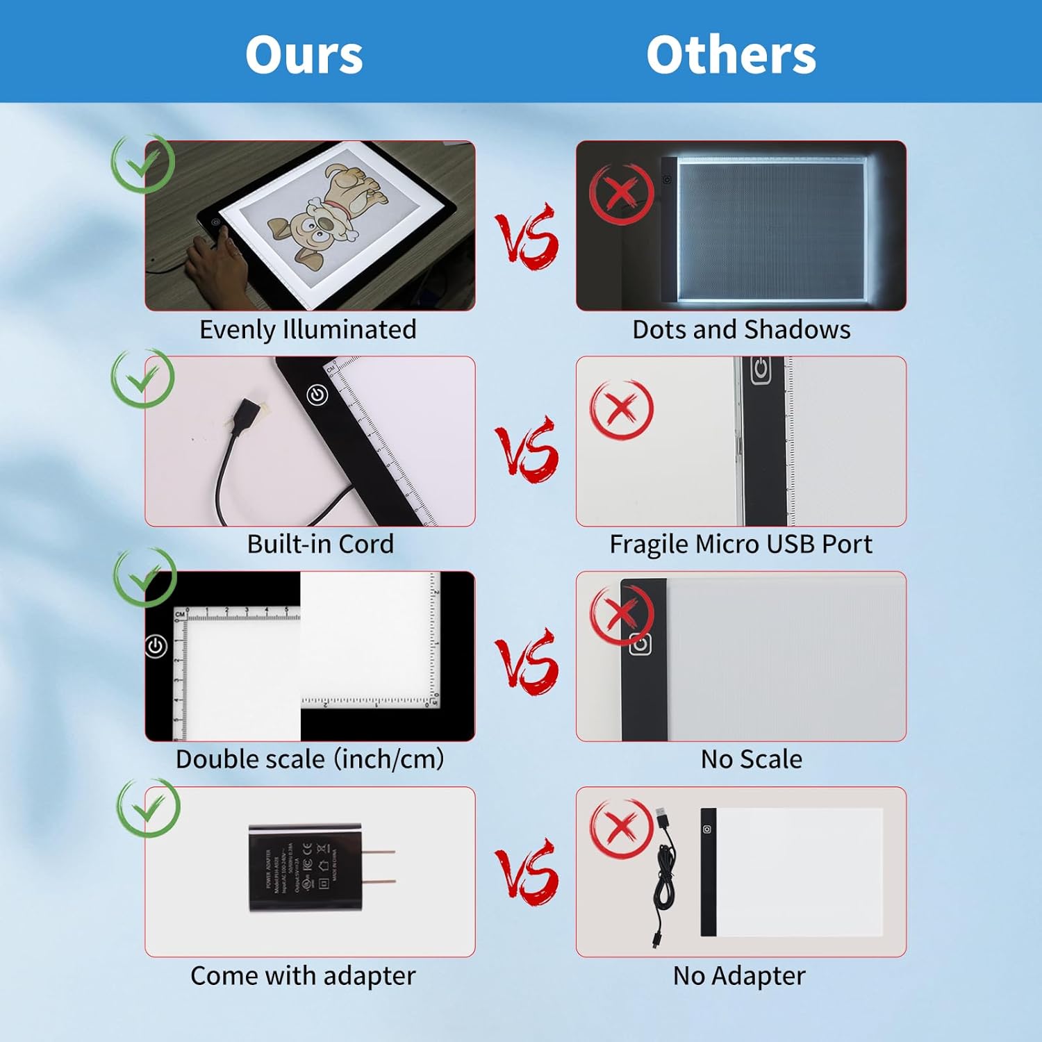 - 【 Innovative Design 】 This super bright light box for tracing has a fixed cord for plugging in. It is much easier to connect and disconnect, and the built-in cord will protect the integrity of the power supply system. Which makes it much more sturdy and durable than micro USB.
