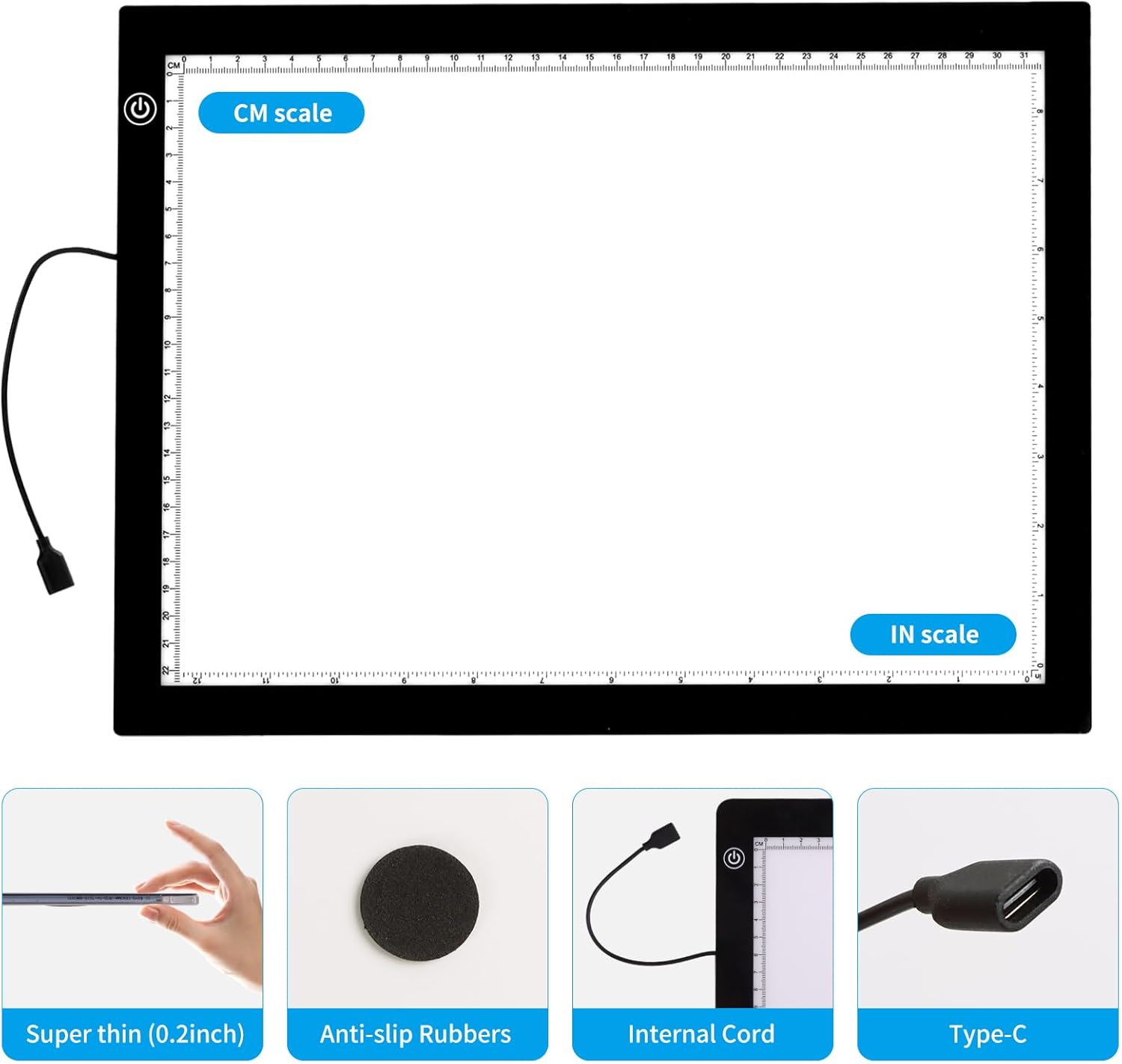 - 【 Innovative Design 】 This super bright light box for tracing has a fixed cord for plugging in. It is much easier to connect and disconnect, and the built-in cord will protect the integrity of the power supply system. Which makes it much more sturdy and durable than micro USB.