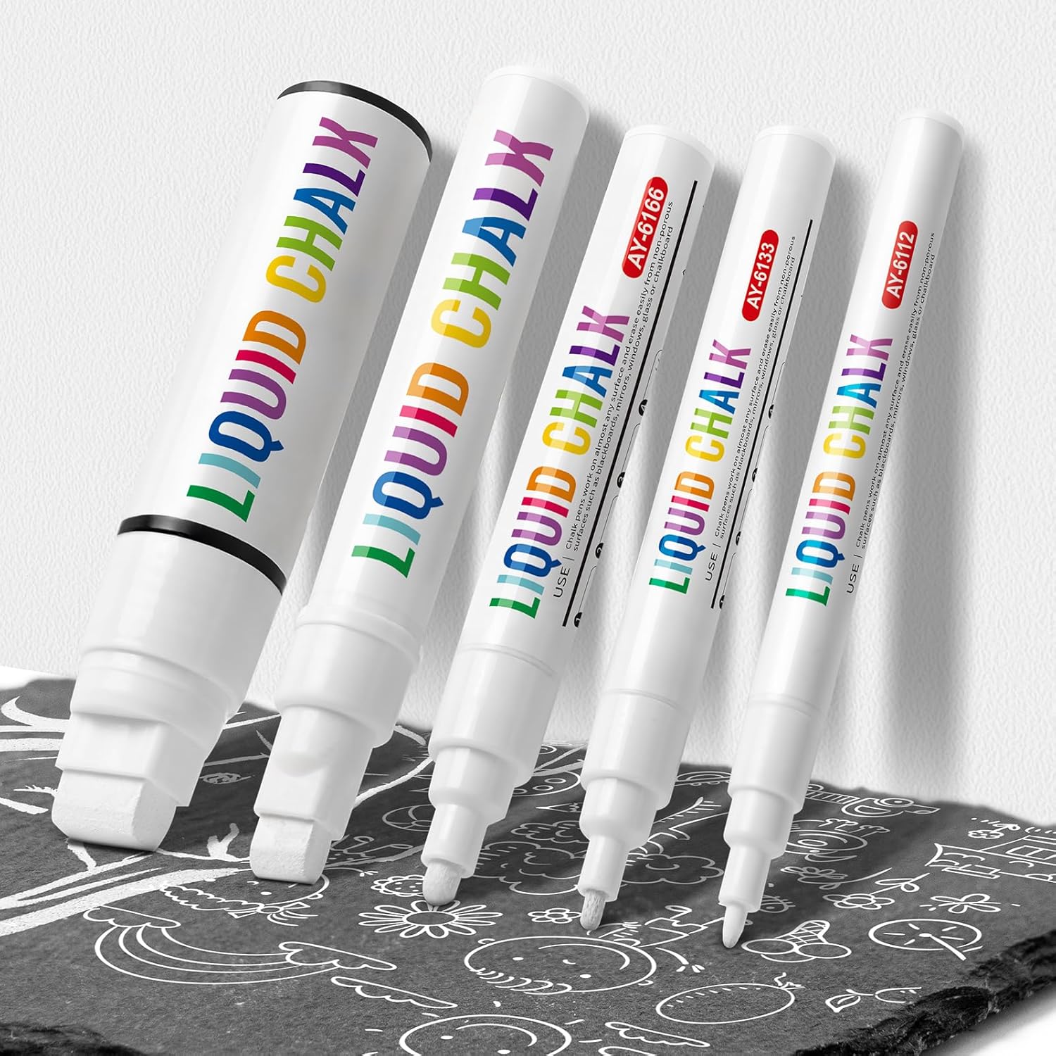- Chalk Pens Tip: 1mm, 3mm, 6mm, 10mm, 15mm - All in one set of White chalk markers Extra fine point, Fine tip (thin), & Bold tip (thick) available to draw broad, medium or fine lines