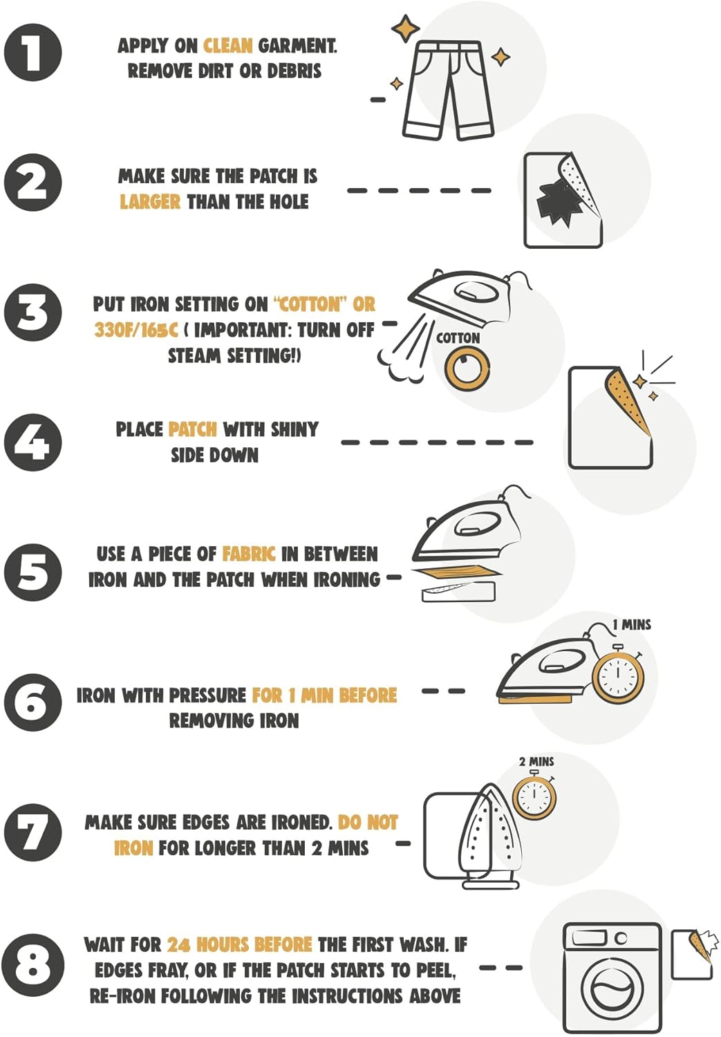 - β Prolong The Life Of Your Favorite Clothes: You can now mend tears in your clothes easily and fast, following our simple, step-by-step instructions. Press with an iron to melt the adhesive backing of the iron patch and you are done.