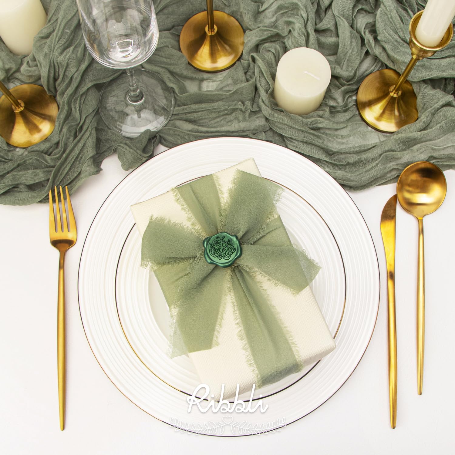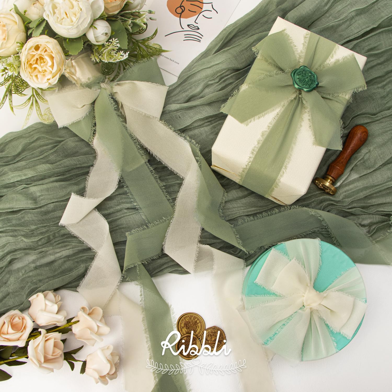 Ribbli Fall Ribbon 1.5 inch x 30 Yard Handmade Silk, Ivory/Dusty Sage/Terracotta Fringe Chiffon Ribbon for Wedding Invitations, Bridal Bouquets Wrapping, Flower Arrangement Decoration