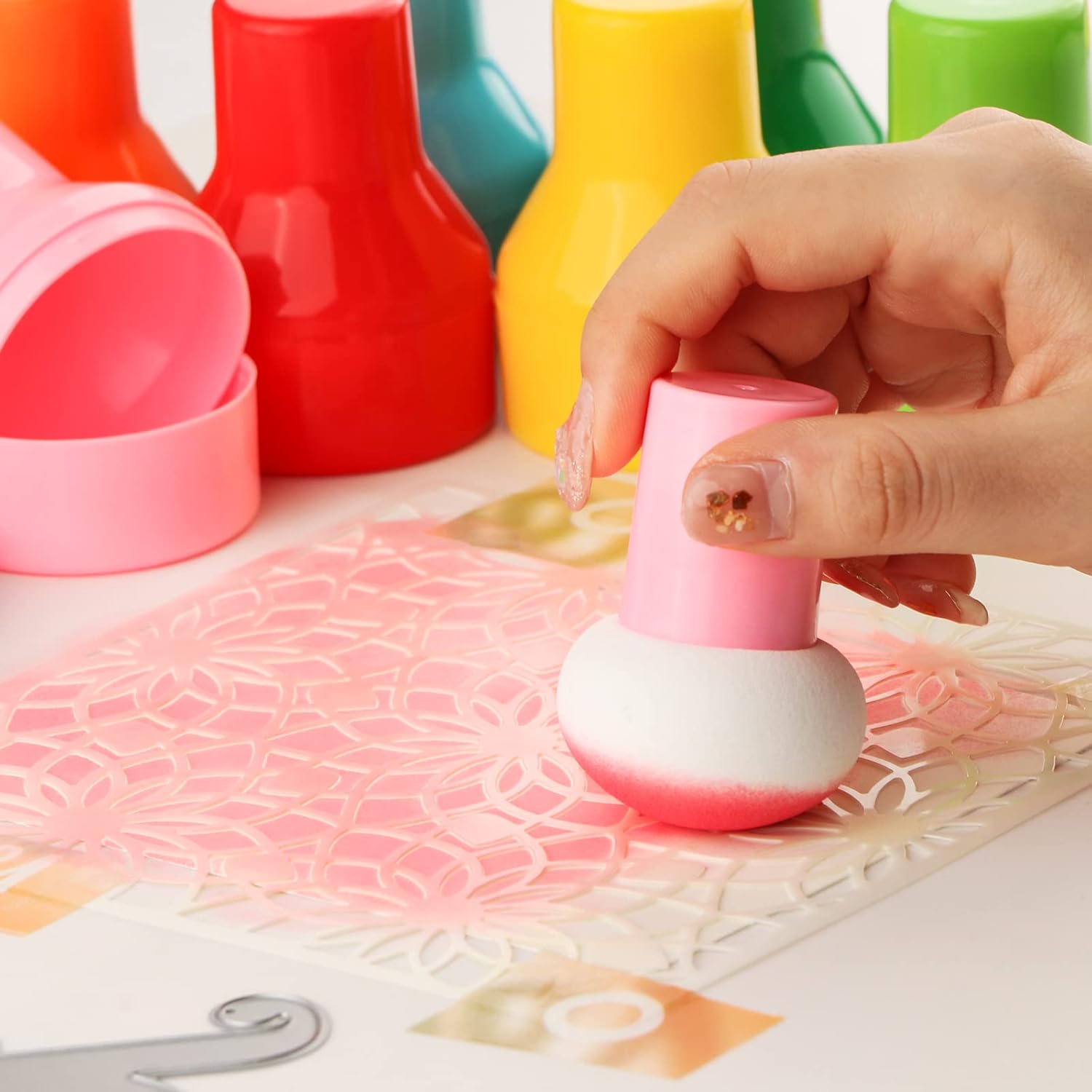 - 【How to use】Quick and easy way to apply water based ink, watercolors, & embossing ink. You pounce the ink directly onto your surface, rather than blend. The high-quality sponge will not tear or snag delicate die cuts or stencils. For targeted control, hold where the handle meets the sponge.