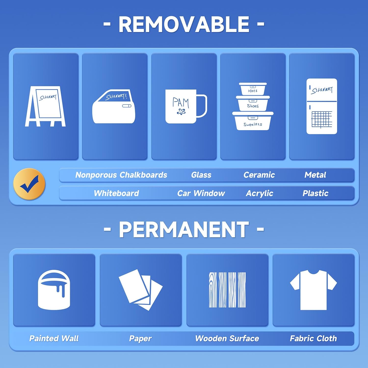 - Versatile. For use on chalkboards, glass, windows and most nonporous surfaces. Ideal for kids, mothers, students, artists and vendors.