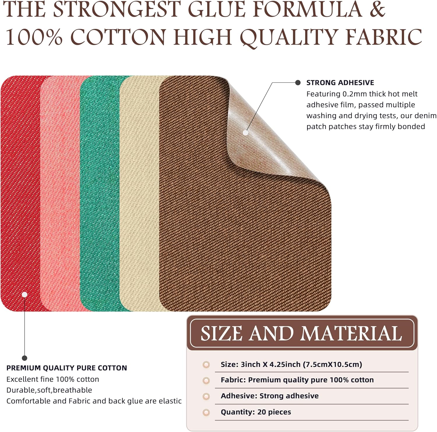 KING MOUNTAIN Iron-on Repair Patch 20 Pcs Pack,Denim Patches for Jeans Kit 3" by 4-1/4", 100% Cotton Denim Iron-on Repair Patch,Jeans and Clothing Repair and Decoration Kit (Five Color 2.0)