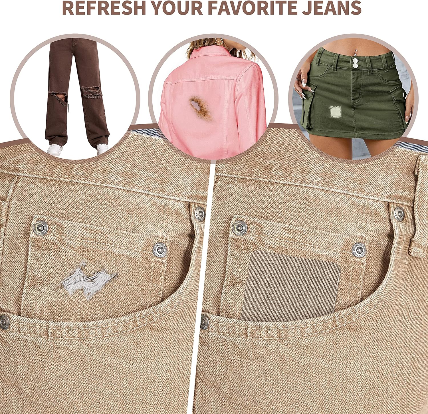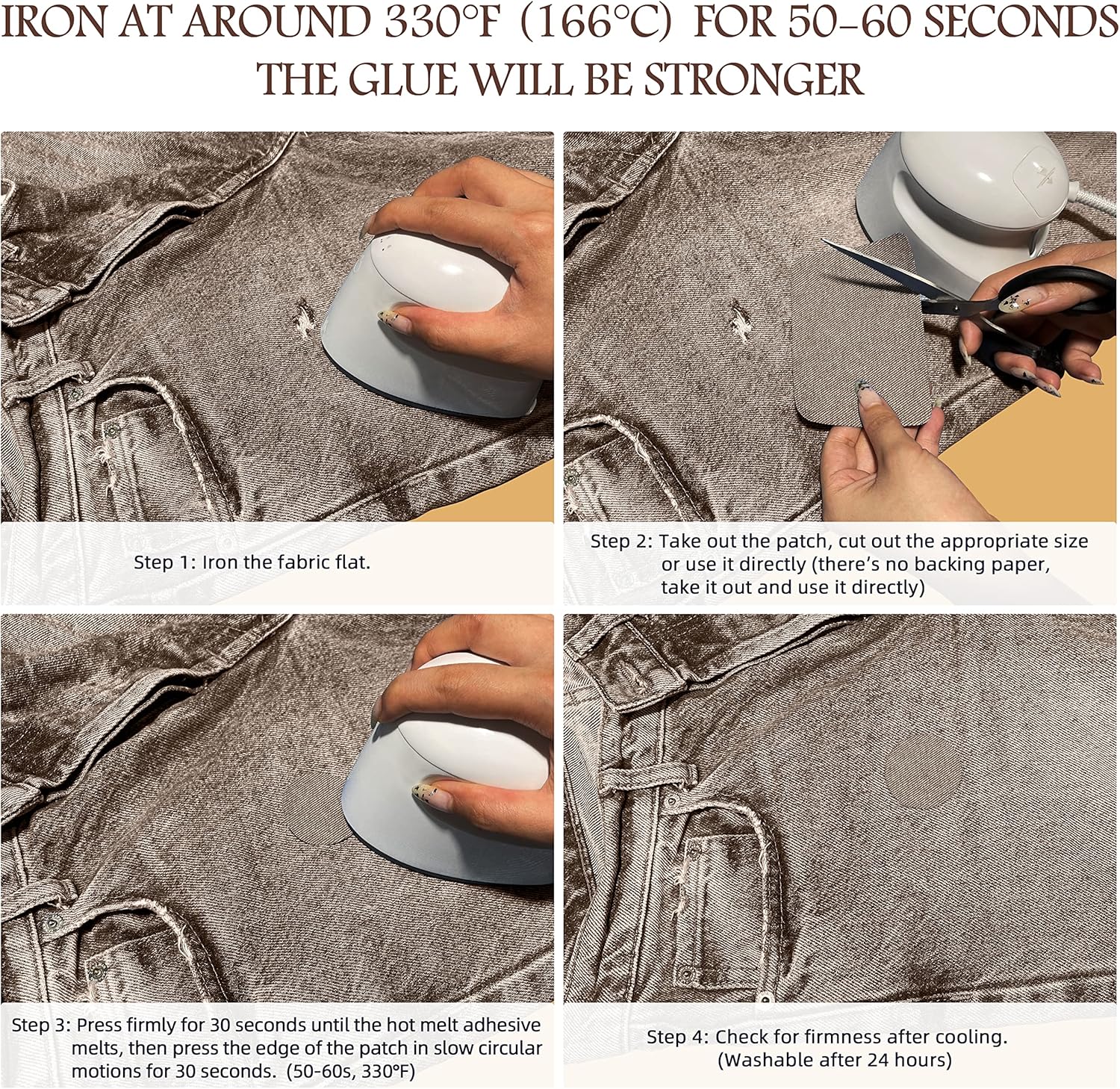 - Easier to Use: Our denim iron-on repair patches can repair or decorate your clothes in minutes, easy to apply in clothing repair, reinforcement, decoration. Open the package, remove the denim patch, stick it on the proper spot and iron at 330Β°F for one minute. (Can be used both inside and outside, no backing, no instructions for use)