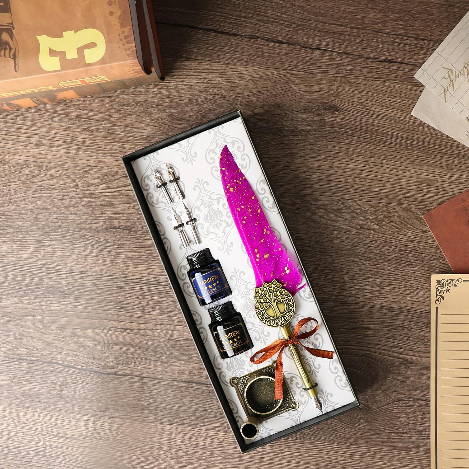 Feather Pen and Ink Set,quill pen ink set,Antique Calligraphy Pen with 4 Replaceable Nibs,2 Bottle of ink,Pen Holder Christmas Gift for Men&Women.(Purple)