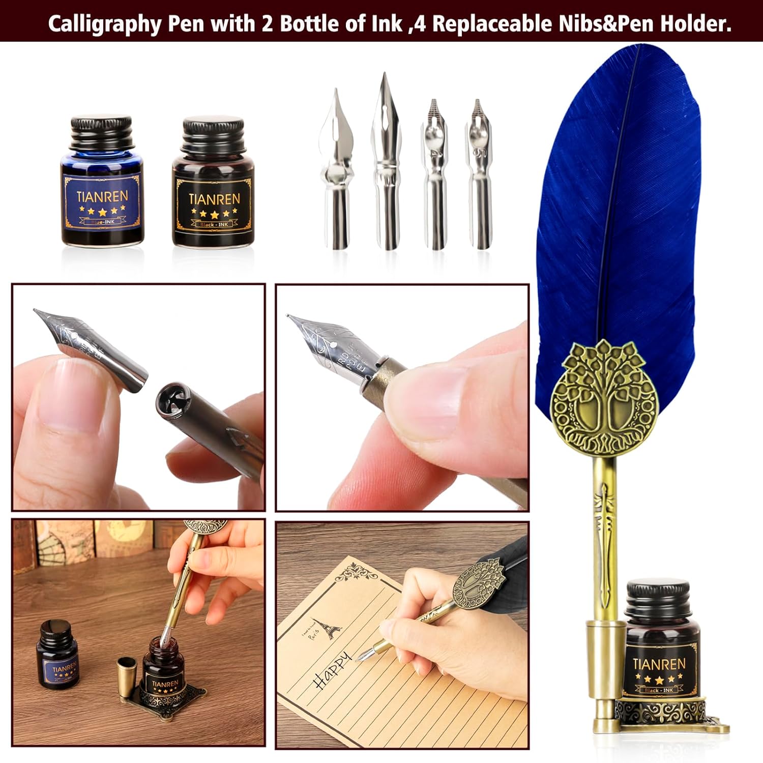- 【Calligraphy Pen Set Included】-1 x feather dip Pen, 2 x bottle of ink(black,blue),1 x bronze pen holder&bottle of ink holder,4 x different sizes stainless steel replaceable nibs,1 x beautiful gift box,the TIANREN antique quill pen ink set suitable for calligraphy beginners or the one who loves of writing.