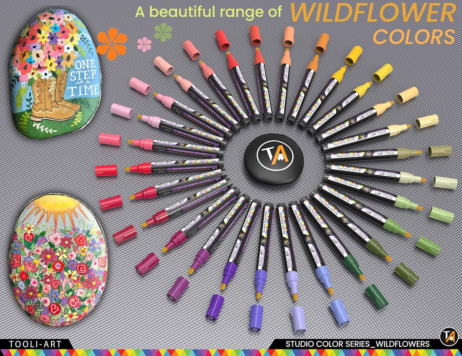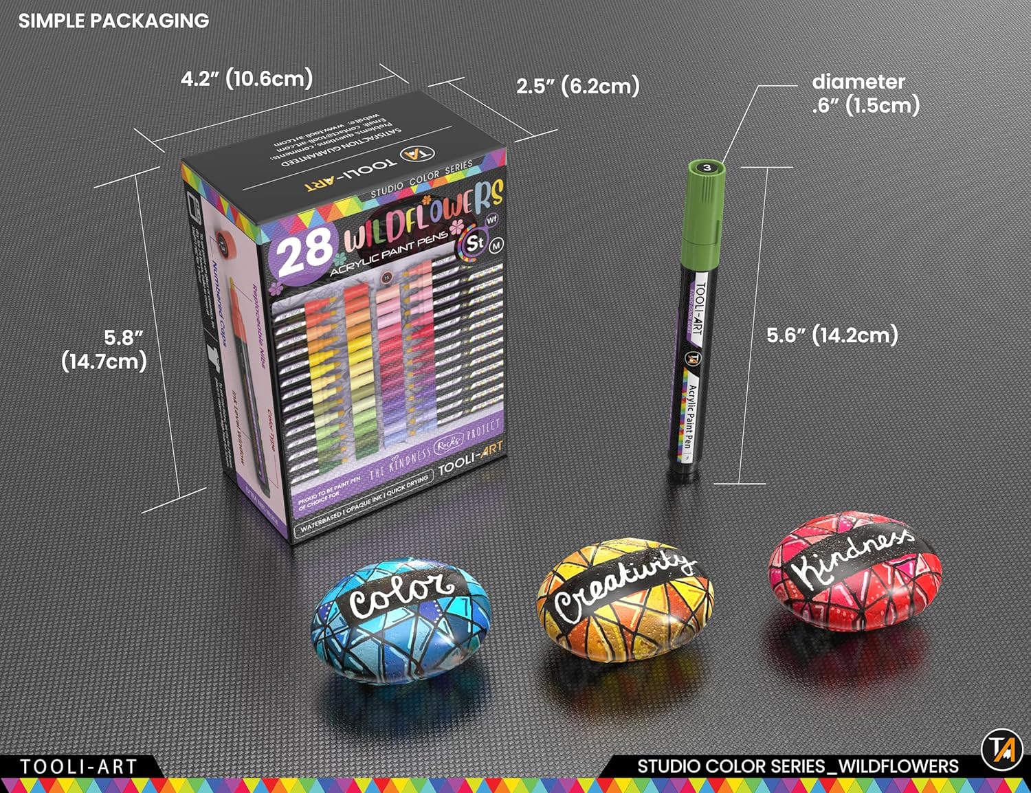 28 Wildflower Colors Acrylic Paint Pens Studio Color Series Markers Set 3mm Medium Tip, Rock Painting, Glass, Mugs, Wood, Metal, Canvas, DIY Projects, Detailing. Non Toxic, Waterbased, Quick Drying