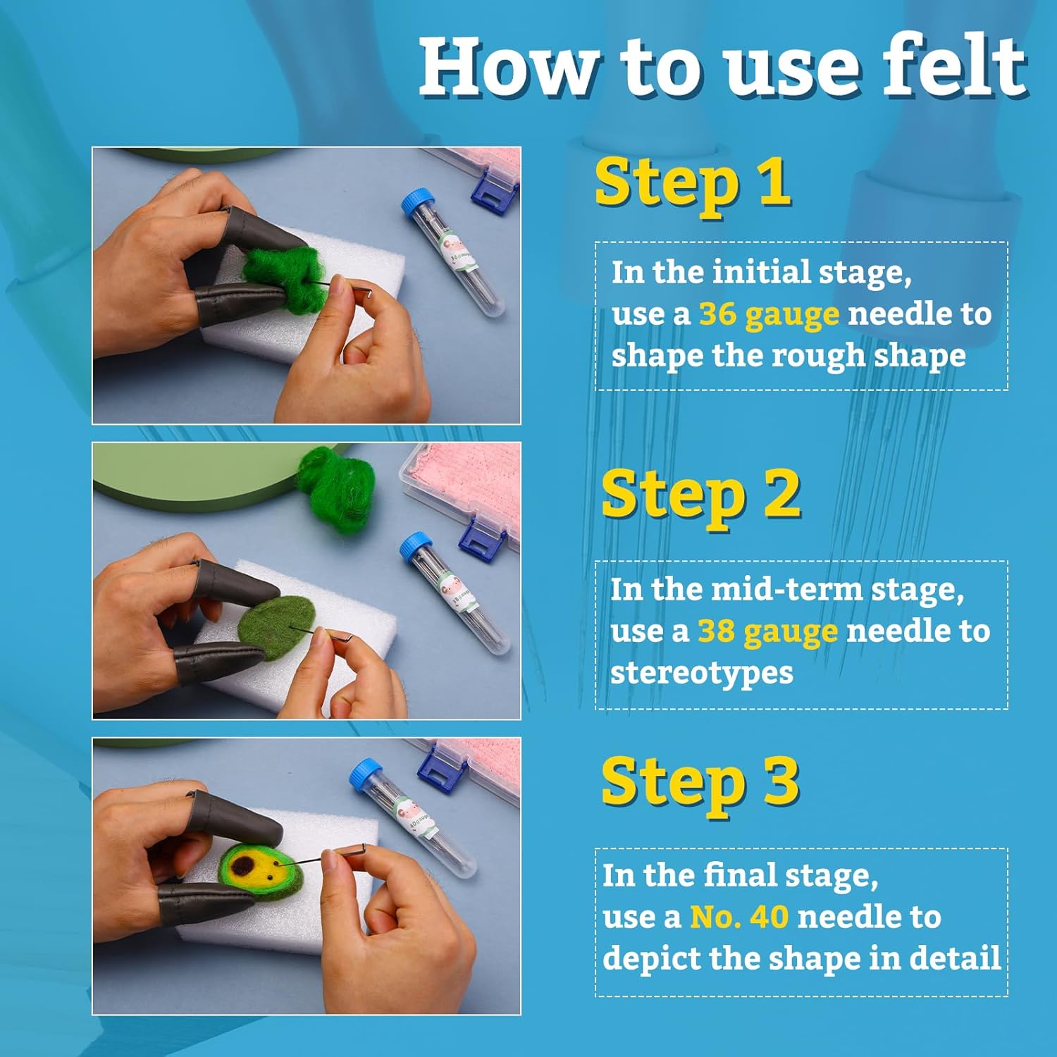 - Basic Wool Felt ToolS Kit: You can easily start your felting craft with the provided needle felting kit with 1pcs wooden felting tool, 1pcs awl, 1pcs snips, 2pcs finger protectors, 60 pcs felting needles, 1pcs glue stick, 1pcs foam pad, 1 pcs wood handle tool with 8 needles on it (total 68pcs feling needles).
