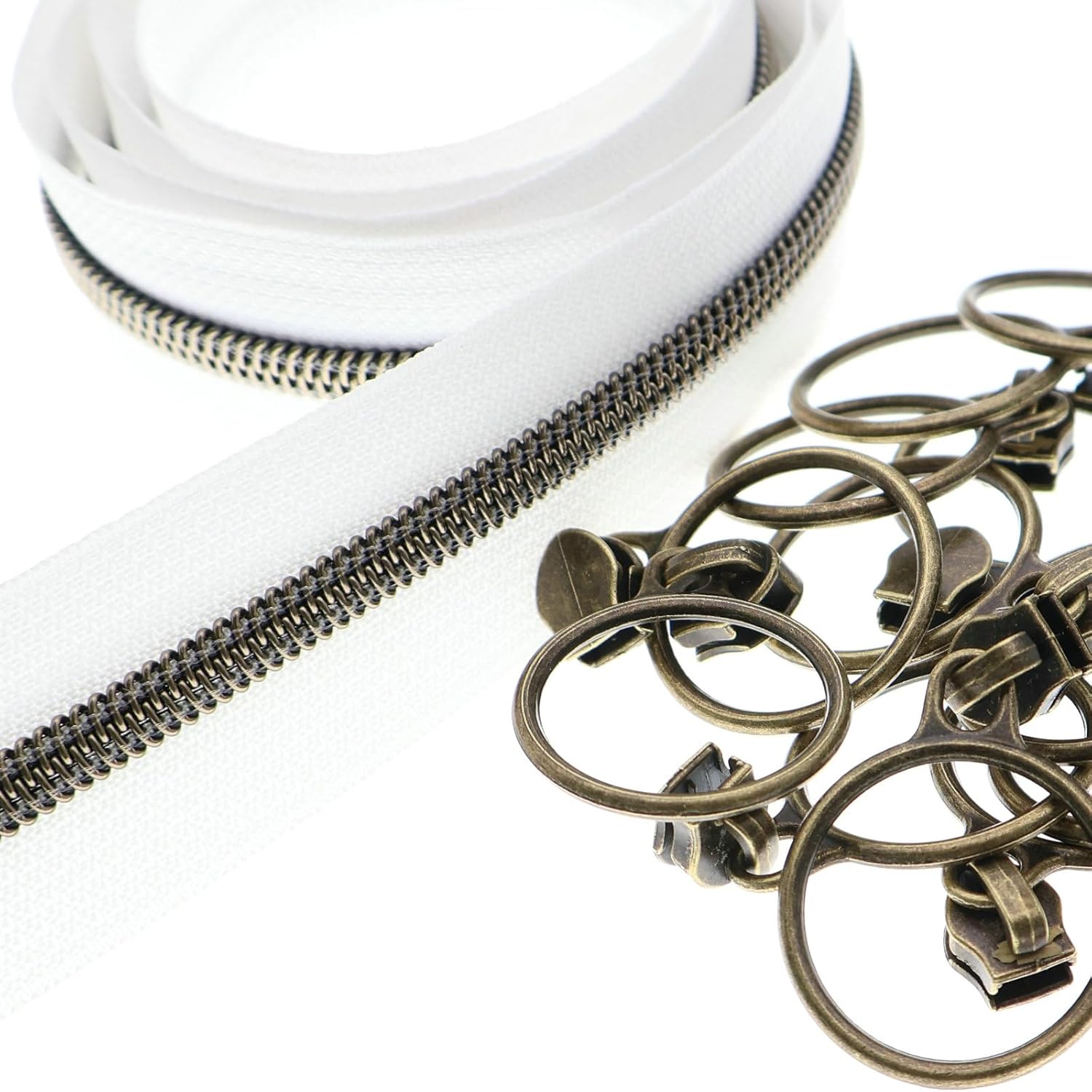 Leekayer #5 Antique Brass Metallic Nylon Coil Zippers by The Yard Bulk 10 Yards White Zipper Tape with 25pcs Antique Brass Ring Pull Sliders for DIY Sewing Tailor Craft Bag(White)