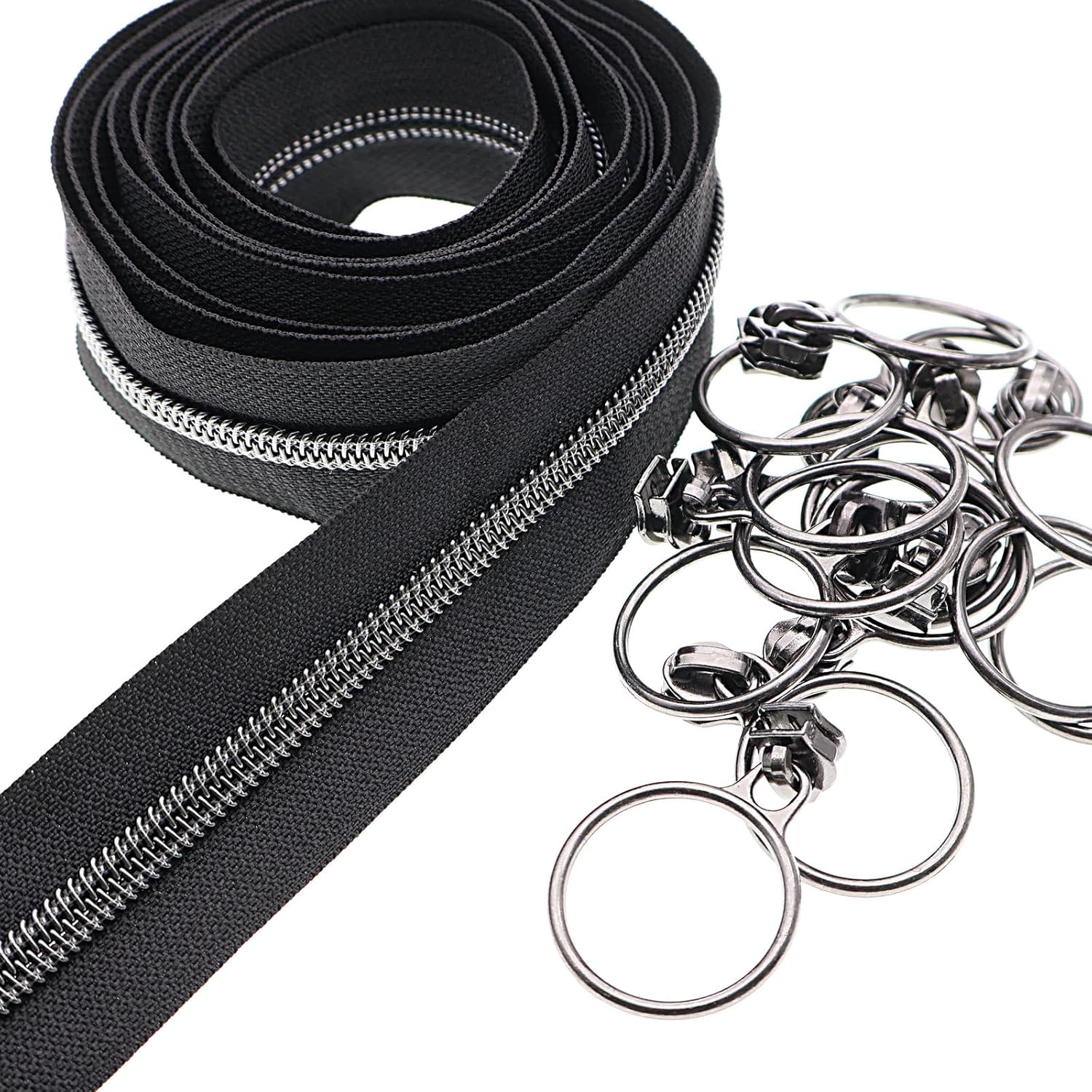 Leekayer #5 Black Nickel Metallic Nylon Coil Teeth Zippers by The Yard Bulk 10 Yards Black Zipper Tape with 25pcs Black Nickel Ring Pull Sliders for DIY Sewing Tailor Craft Bag(Black)