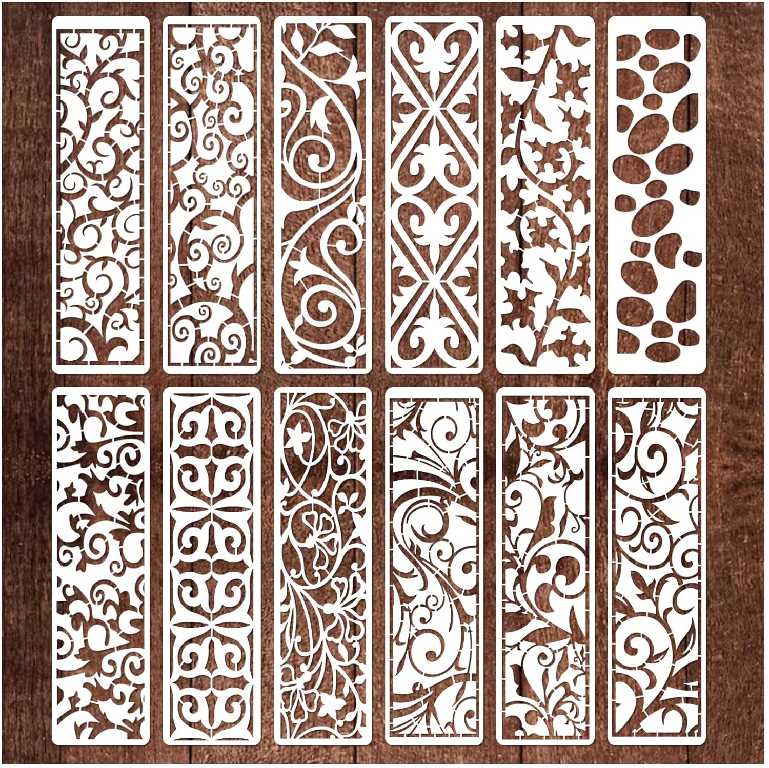 12 Pieces Border Stencils for Painting, Leaf Stencil Template Reusable Furniture Cake Decorative Stencils for Wood DIY Craft Canvas Fabric (12 Border Floral)