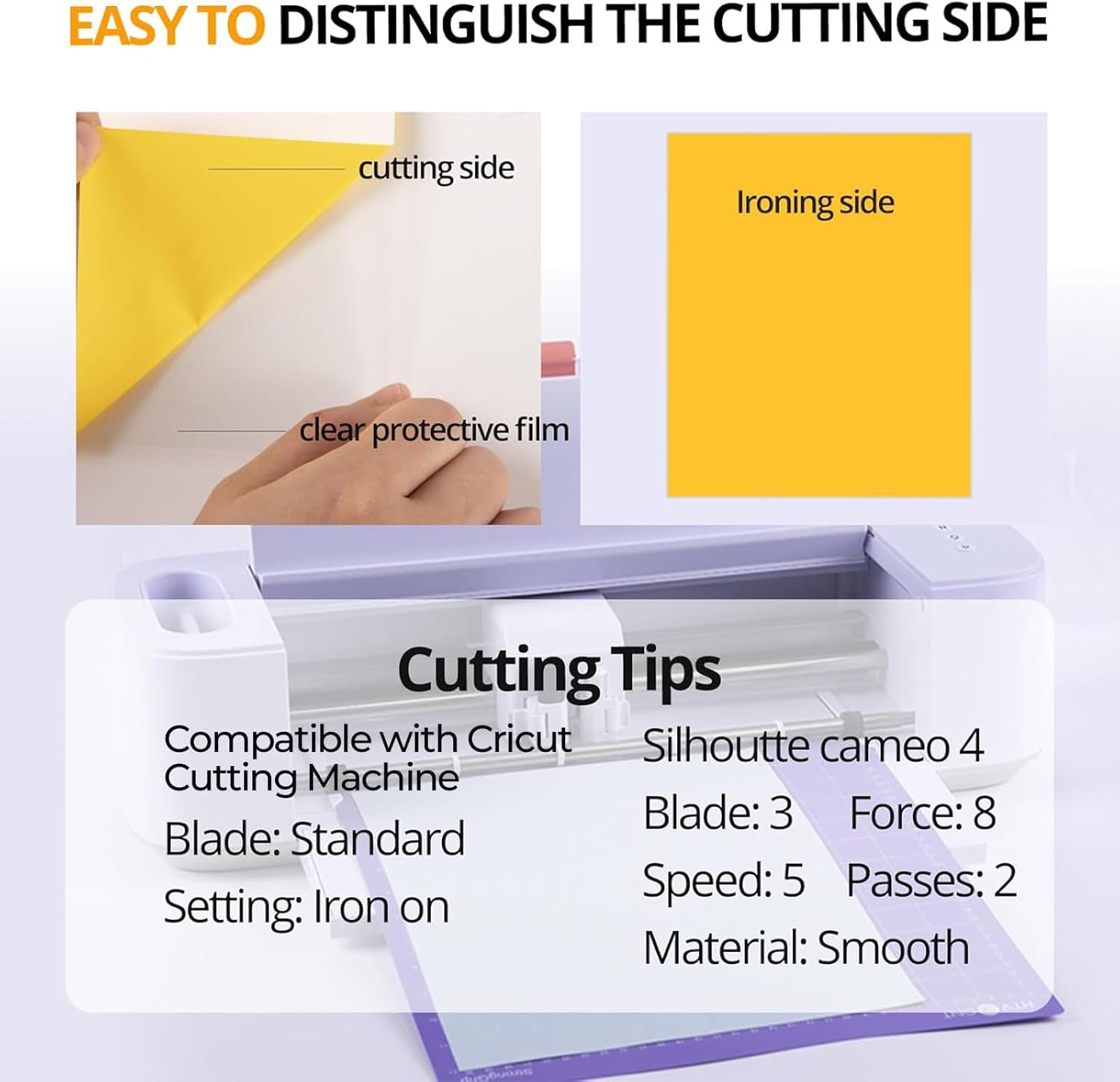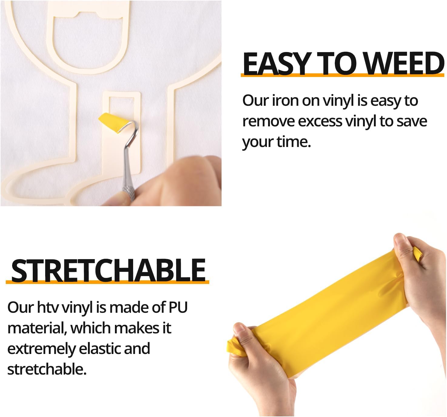- 【EASY TO CUT & WEED & Transfer】The yellow heat transfer vinyl is smooth and thin, so it is easier to cut and weed, which saves the time you may waste on each image or letter, and even complex designs can be transferred perfectly. Our iron on vinyl for t shirts can be compatible with Silhouette Cameo, Cricut Maker and Heat Press, very easy to use, you can easily create unique and personalized design.