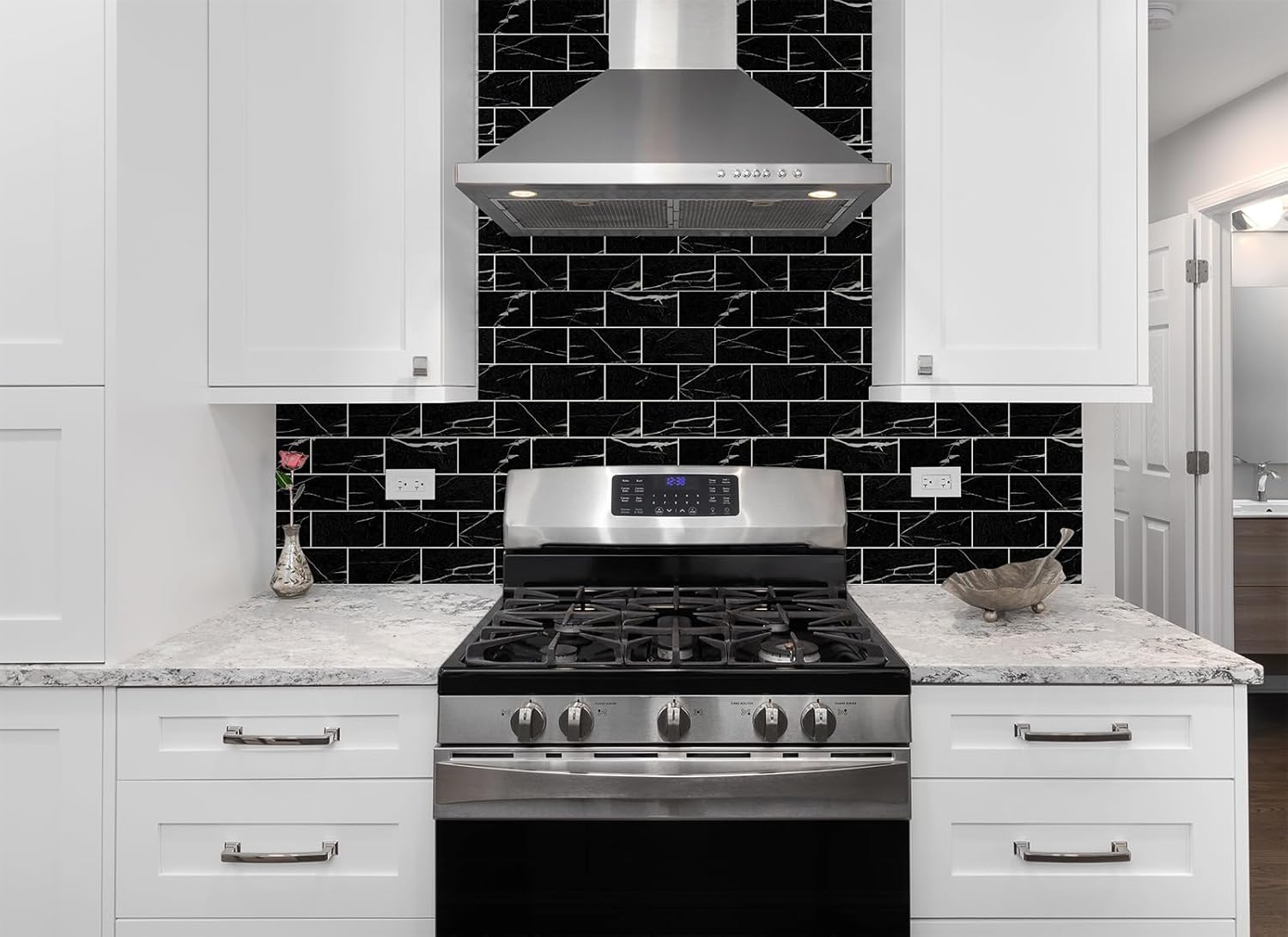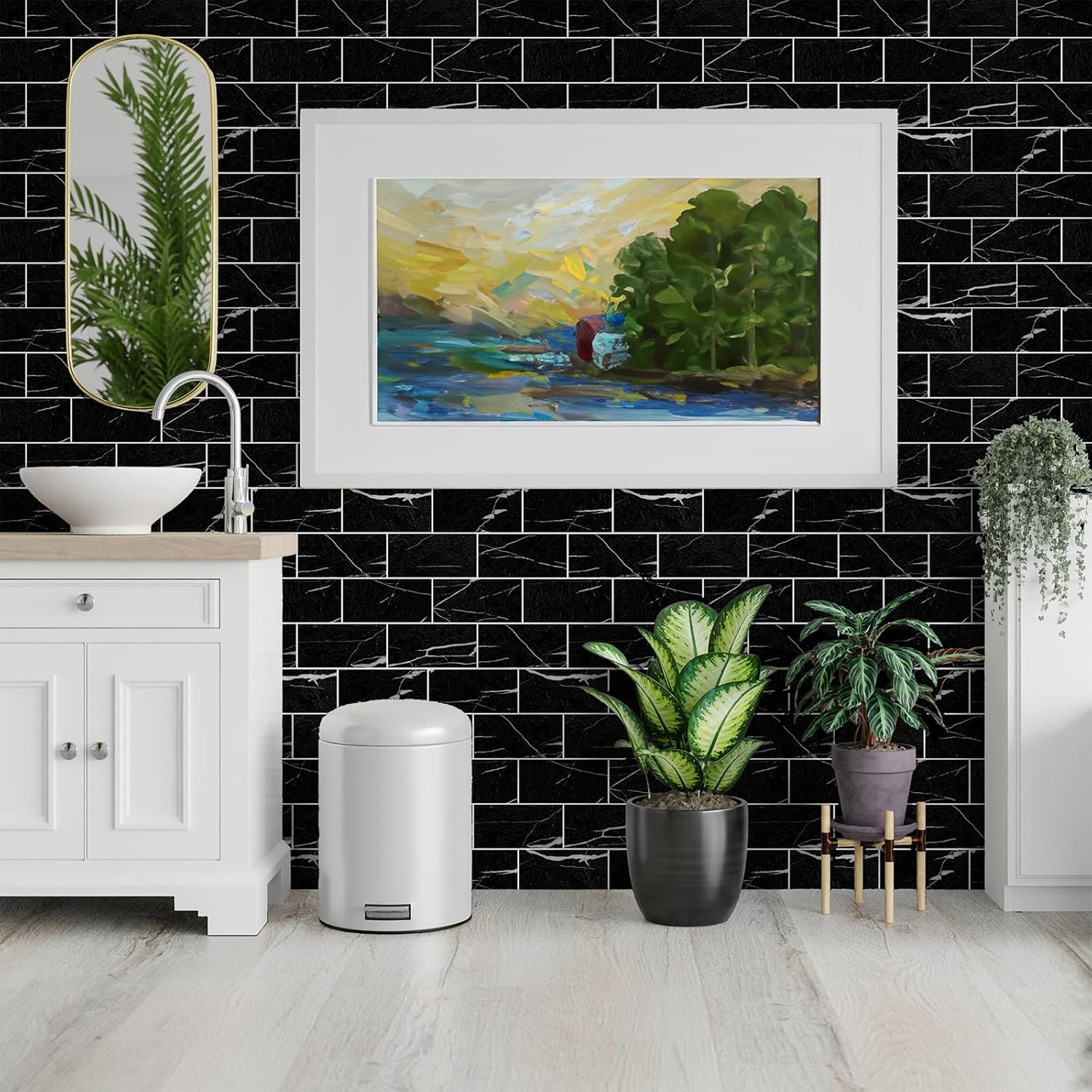100 Pieces Peel and Stick Backsplash for Kitchen, 3" x 6" PVC Subway Tile Upgraded Nero Marquina with White Grout Backsplash Stick on Tile Elevate Kitchen, Bathroom, Fireplace,RV