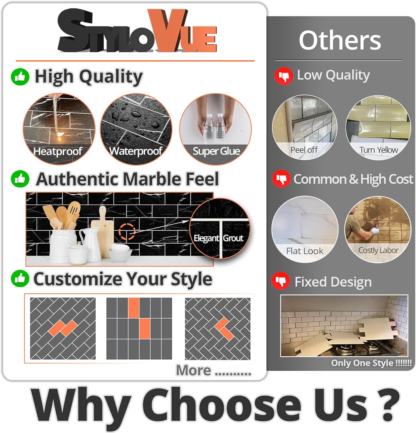 - ๐๐ฅ๐๐ฏ๐๐ญ๐ ๐๐จ๐ฎ๐ซ ๐๐ฉ๐๐๐: Featuring unique slot edges for a realistic grout-look, StyloVue self adhesive wall tiles offer an authentic design and texture that customers adore. Elevate the aesthetic of your space while simplifying maintenance and cleaning, without the hassle of traditional grouting.