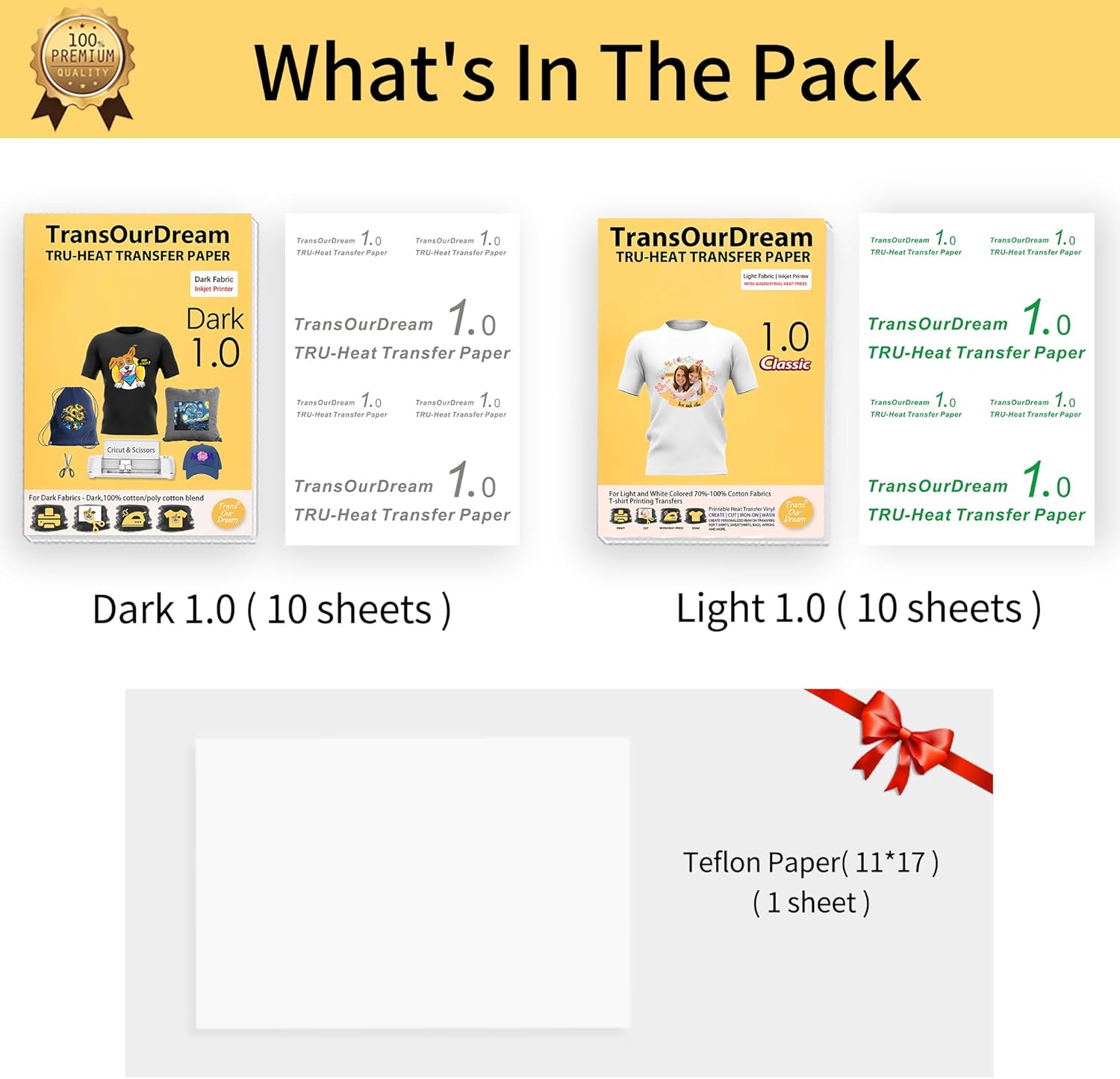 - 💕TRU-TRANSFER PAPER: Pack of 5 sheets Dark 1.0 heat transfer paper, 5 sheets Light 1.0 heat transfer paper and 1 sheet reusable teflon paper. These iron on transfer papers are print in vivid & vibrant colors. The transferred image is soft and breathable. One mix pack gives you more than one choice for heat transfer.