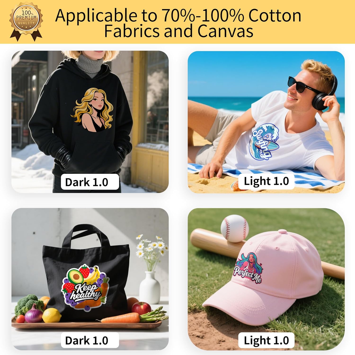 - 💕APPLICATIONS: Transfer text, images, photos and pictures onto 70%-100% cotton fabrics, such as sweatshirts, hoodies, totes, canvas bags, aprons, masks, pillow cases, cushion covers, tablecloths, flags and banners. Make custom DIY gifts to your family or your friends on Mother's Day, Father's Day, Birthday, Thanksgiving, Easter, Halloween, Christmas, Valentine's Day or Wedding Day.