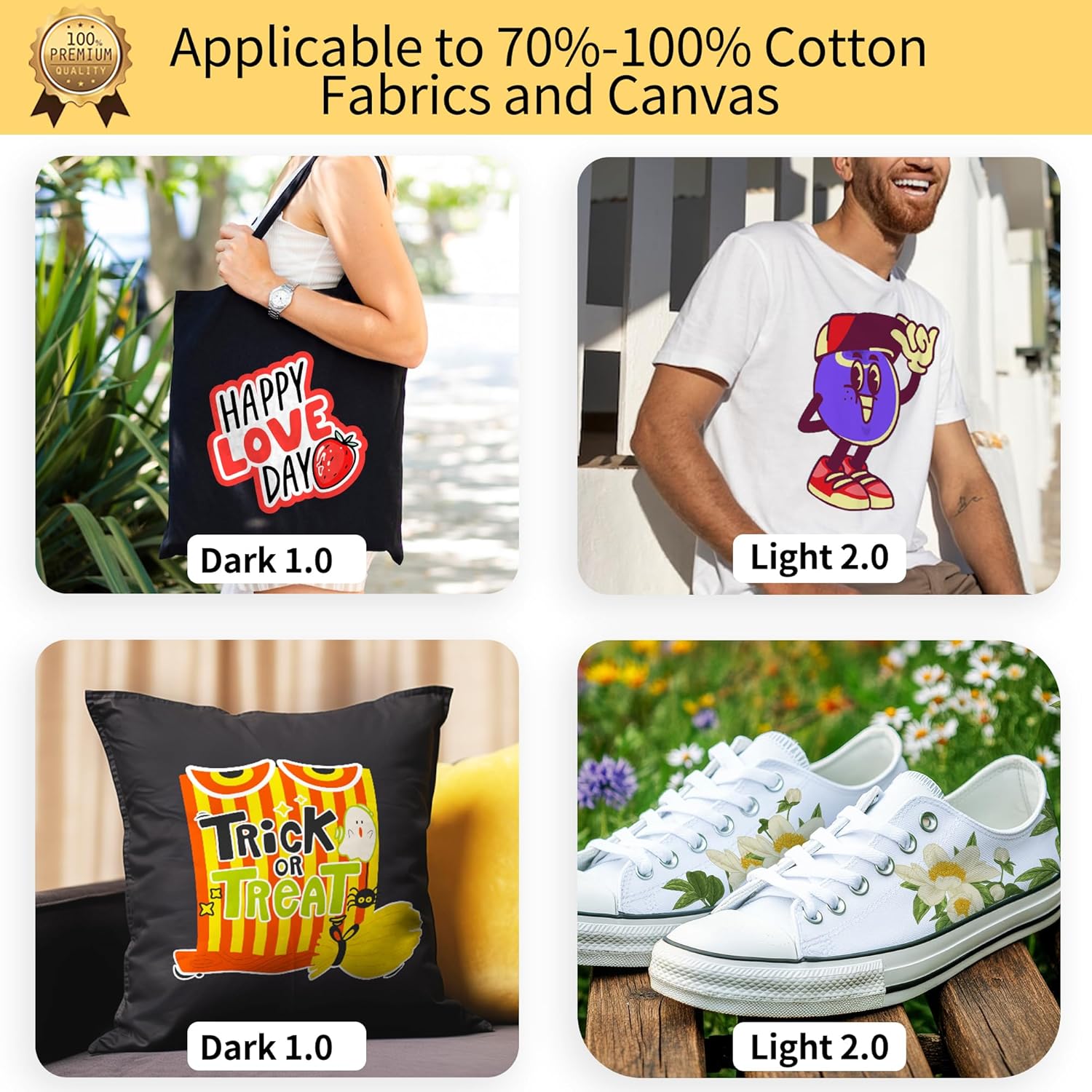 - 💕APPLICATIONS: Transfer text, images, photos and pictures onto 70%-100% cotton fabrics, such as sweatshirts, hoodies, totes, canvas bags, aprons, masks, pillow cases, cushion covers, tablecloths, flags and banners. Make custom DIY gifts to your family or your friends on Mother's Day, Father's Day, Birthday, Thanksgiving, Easter, Halloween, Christmas, Valentine's Day or Wedding Day.