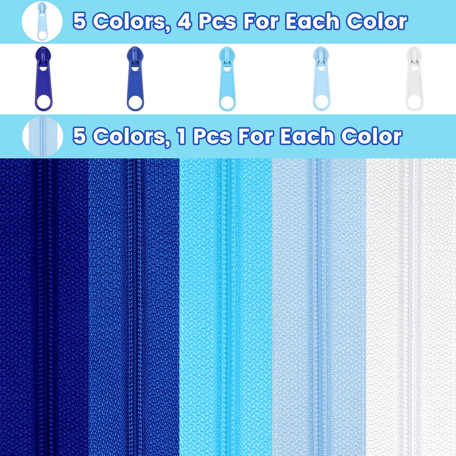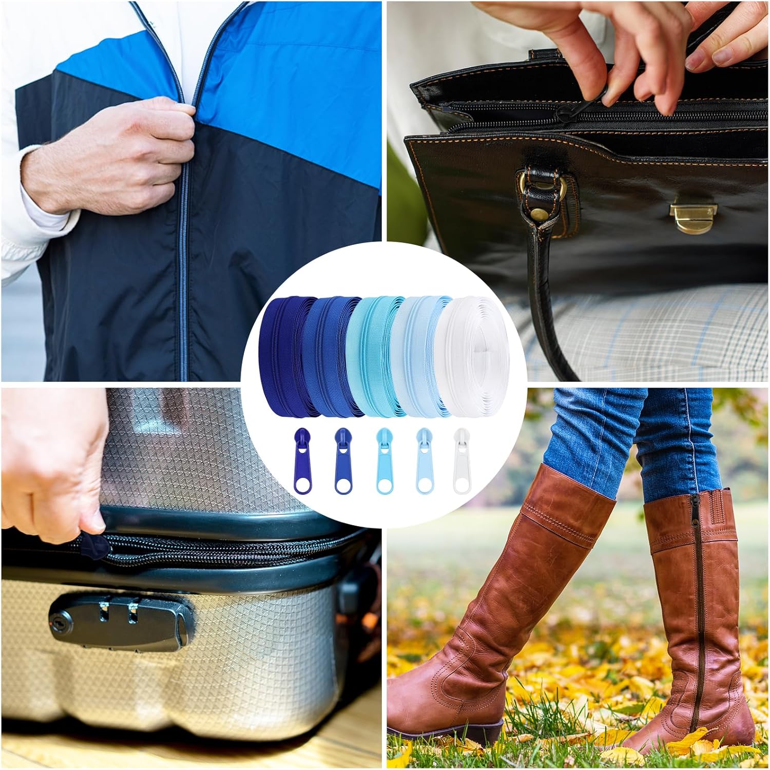DOITEM 15.3 Yards/ 14 m 5 Pieces Assorted Colors #3 Nylon Coil Zippers, Sewing Zippers Endless Zips with 20 Pieces Zipper Sliders Zip Heads for DIY Sewing Tailor Craft Supplies (Blue White)
