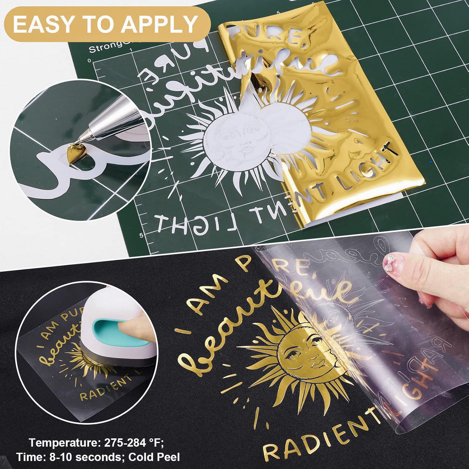 - ✨ EASY TO APPLY: Just use craft cutting machine and a home iron to get the job done. Apply for approximately 10-12 seconds at 266-284°F (130-140°C) and about 10 LBS of pressure. Be sure to cold peel.