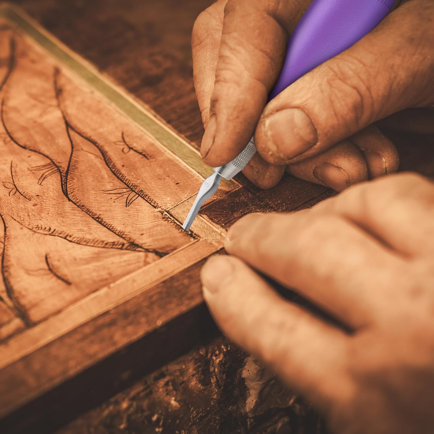 - Linoleum carving tools: each set of our engraving tools comes with 6 types of cutting blades: small, medium and large size V-shaped knife, U-shaped knife, round knife and flat knife to easily achieve a variety of engraving effects. When changing the blade, you need to unscrew the top chuck first, then put the blade into the slot, replace the top and tighten it
