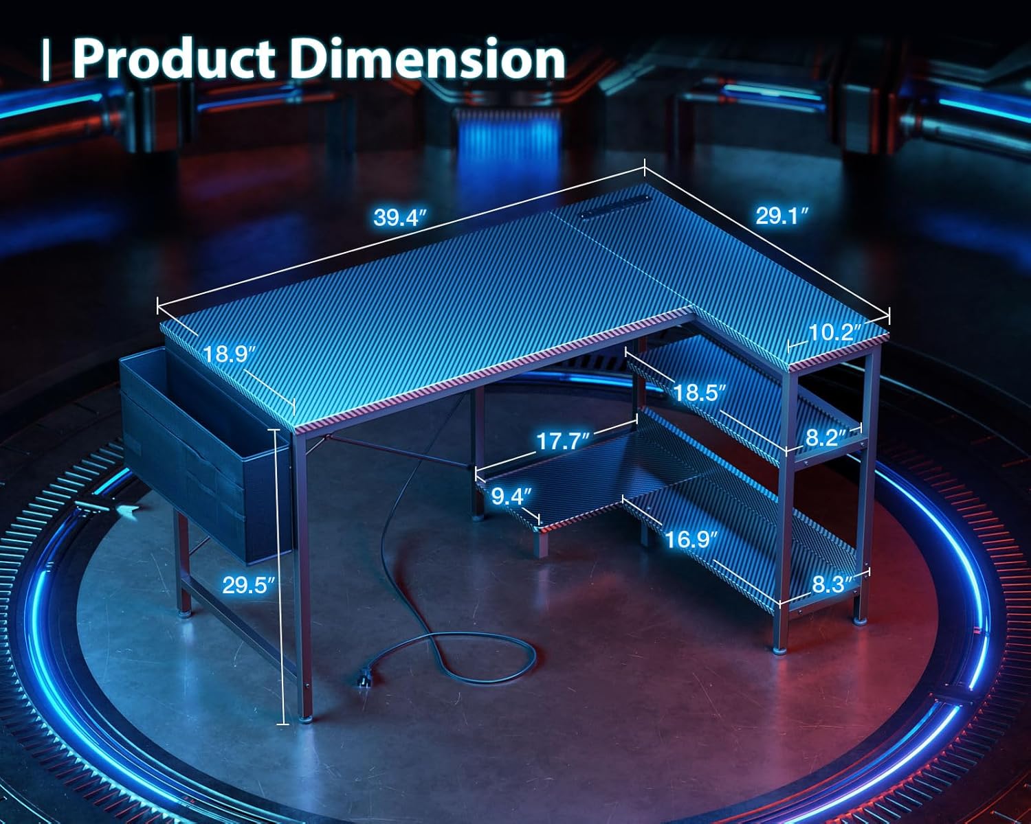 ODK 40 Inch Small L Shaped Gaming Computer Desk with Power Outlets, Corner Desk with Reversible Storage Shelves & PC Stand for Small Space, Modern Simple Home Office Table, Carbon Fiber Surface, Black