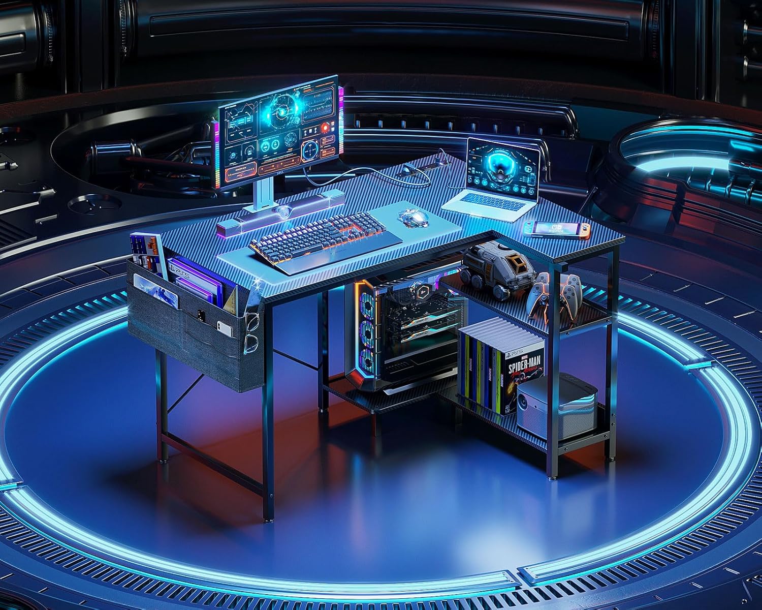 - ăReversible Corner Desk for Small Spaceă: The l desk fits perfectly any places in a corner, which maximize your limited spaces. This modern minimalist desk will be a beautiful decor in your living room, bedroom, office, dormitory, gaming room, childrenâs room. You can customize the shelves on your left or right follow your personal habits.
