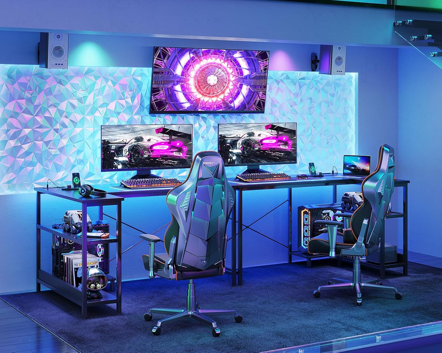 - ăSuper Ample Storage SpaceăWith Two-tier open shelves and PC stand providing maximally ample space for your PC case, books, files, devices for convenience usage, and side storage bag helps you store gaming devices or office stuffs.