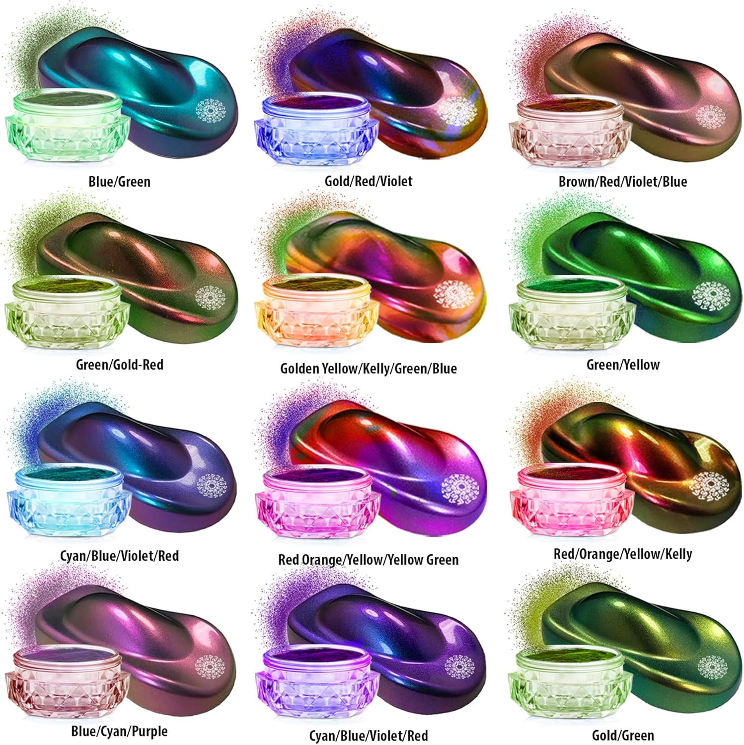- ❤️ INTENSE CHAMELEON MICA POWDER - The set includes 12 high intensity chameleon mica powders and brush. Each jar contains 1g bottles (Total 12g) covering hues of all shades with an eye-catching color changing and shimmering glow. This is not regular chameleon pigment, you get much more intense, this is the highest grade of chameleon pigment available!